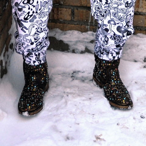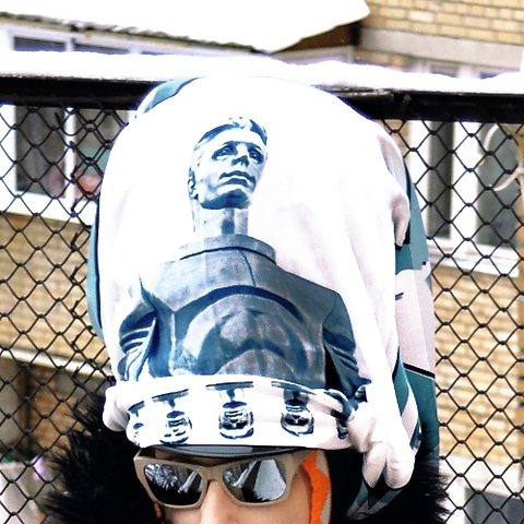 На Андрее: платок с Гагариным Patricia Shishmanoff, шлемофон Walter Van Beirendonck, очки Leroy & Perry, куртка Walter Van Beirendonck, пояс Andrew Mackenzie, варежки Mercibeaucoup, штаны Kokon to Zai, цыганские сапоги D&G