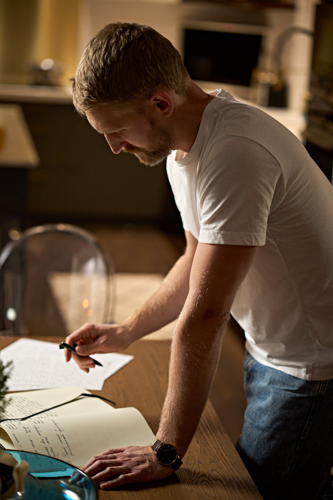 Мне было 25, когда я его придумывал. Там есть ошибки и недочёты, но этот дом максимально удобен и эстетичен для большой семьи. Он отражает мою эстетику, но при этом разрешает быть неидеальным. В нём много решений, которые не каждый примет: полностью стеклянная стена в ванную из спальни, синий потолок в столовой, открытая кирпичная кладка. Чёткого проекта не было – всё делалось на ощущениях. Прошло почти 10 лет, а я с удовольствием возвращаюсь домой. Для себя я могу рискнуть больше – если ошибусь, то только на своей территории. Для клиентов риск тоже интересен, но уже в разумных, обоснованных пределах.