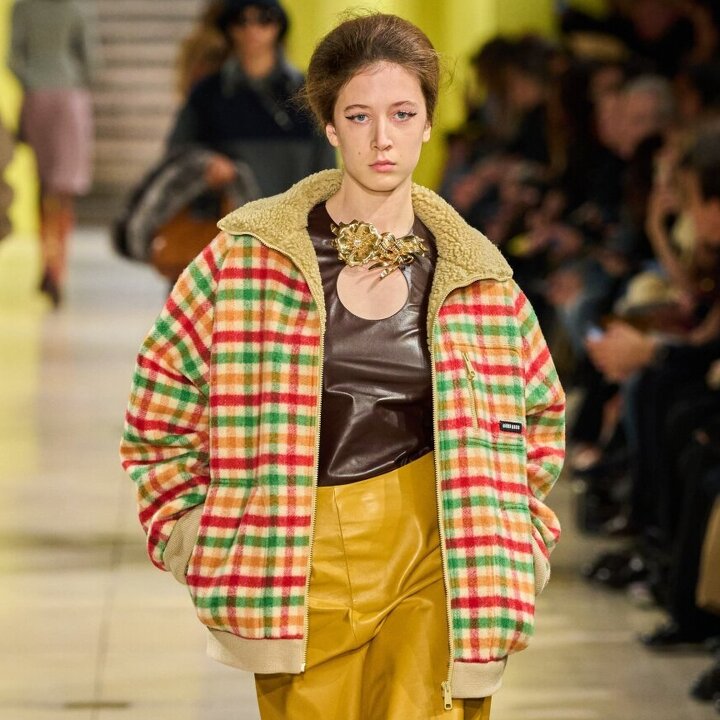 Клетка — еще один вечнозеленый тренд: помимо love-mark бренда Miu Miu, наблюдали бум фэшн-геометрии у авангардистов Collina Strada и Duran Lantink. Тартан (ожидаемо) показал амбассадор рыцарькора Дэниел Ли в Burberry, аргайл поддержала Кэтрин Гольдштейн в Khaite, а новый креативный директор Dries Van Noten Джулиан Клаузнер достал архивную градиентную клетку с гранж-показа 2013 (и лихо смиксовал ее с коврогобеленом).