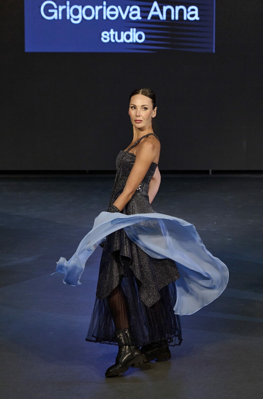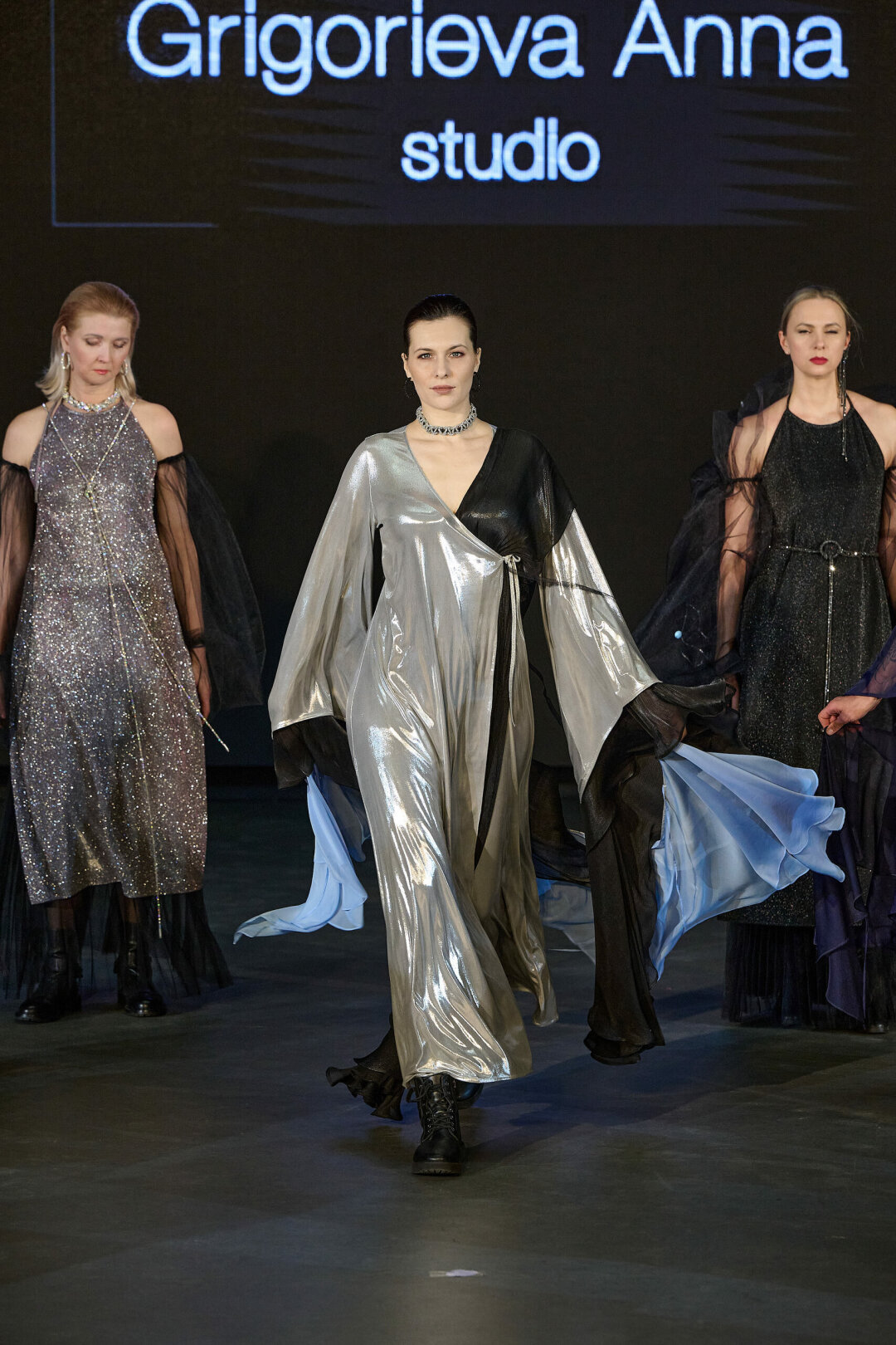 Трикотаж с серебряными переливами символизирует отблески воды на поверхности Енисея. Он придает одежде блеск и элегантность, подчеркивая величие и мощь реки. Трикотажные ткани комфортны и удобны в носке, что делает одежду практичной для повседневной жизни. Прозрачный шифон — легкая и воздушная ткань, олицетворяющая чистоту воды. Шифон добавляет образу легкости и свободы, создавая ощущение воздушности и гармонии с природой.