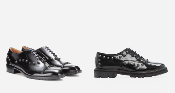 Мы уже писали о том, что ботинки на манер мужских — самые комфортные для осеннего сезона. Модель на тяжелой подошве с шипами Valentino скопировал масс-маркет Mango. В данном случае, нет разницы, что покупать — перед реагентами против гололеда и снега они равны.