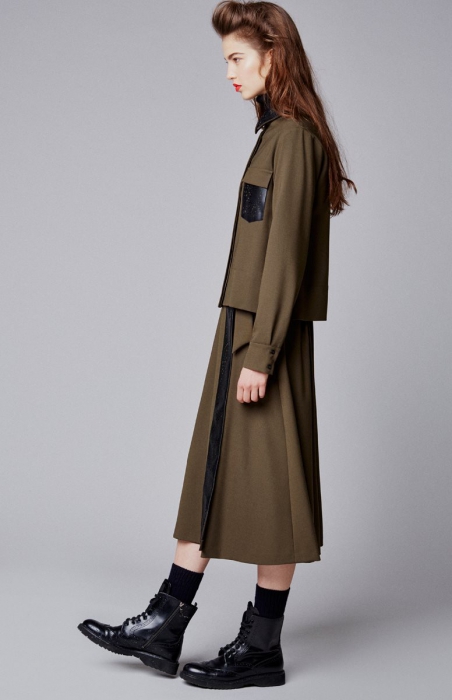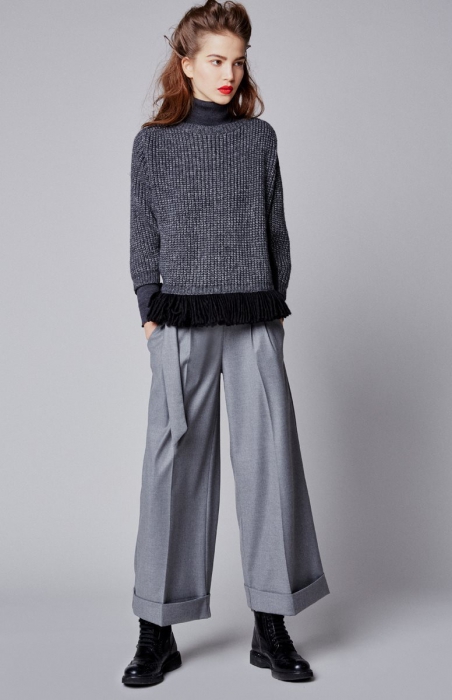 Дизайнеры переиначили на фэшн-лад несколько художественных направлений — сюрреализм, футуризм и импрессионизм. Симбиоз моды и искусства вылился в красные плиссированные платья, юбки миди и основные цвета коллекции, которые так любил Андре Матисс: ржавчины и небесно-синий. Ссылки на сюрреализм можно углядеть в оливковых платьях с графическими узорами, а в ярко-синей и черной палитре верхней одежды и жаккардовых брюк с острыми линиями — опознать абстрактный футуризм. С тканями бренд тоже поиграл на славу: шерстяные свитера, структурированные пальто с мехом, юбки из ламинированной эко-кожи и расшитые фуфайки. Брависсимо, как сказали бы в Италии.