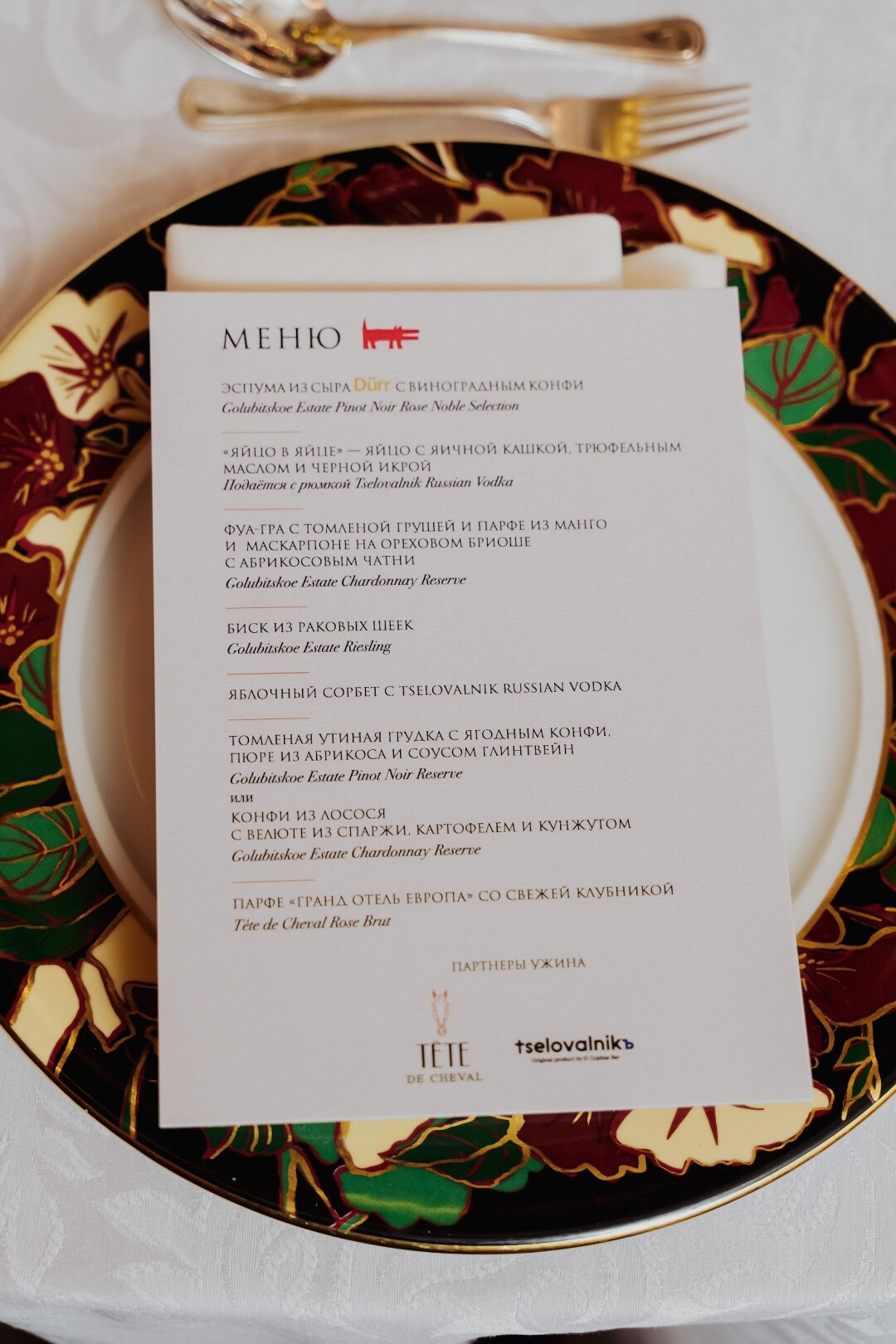 К каждому курсу был предусмотрен бокал насыщенного шардоне, сочного рислинга или благородного пино нуар, а сладкому парфе подыгрывал розовый брют Tête de Cheval.