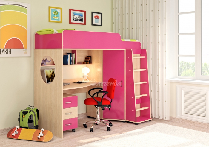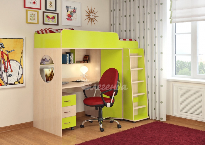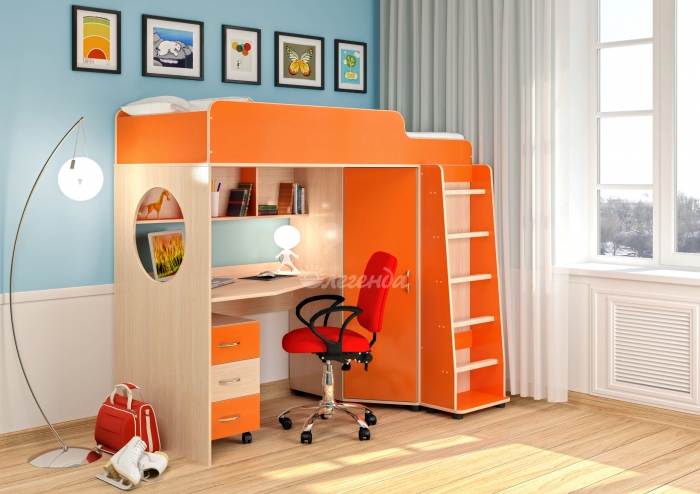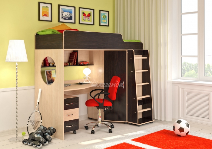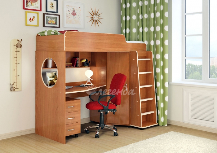 Кровать-чердак — беспроигрышный вариант для малогабаритных квартир. Уютная кровать на втором ярусе придется по душе любителю подвижных игр. За безопасность ребенка можно не переживать, ведь такой вариант места для отдыха оснащен защитным бортиком. Оборудованное внизу рабочее место позволит расположить все необходимое для самых юных на небольшой площади.