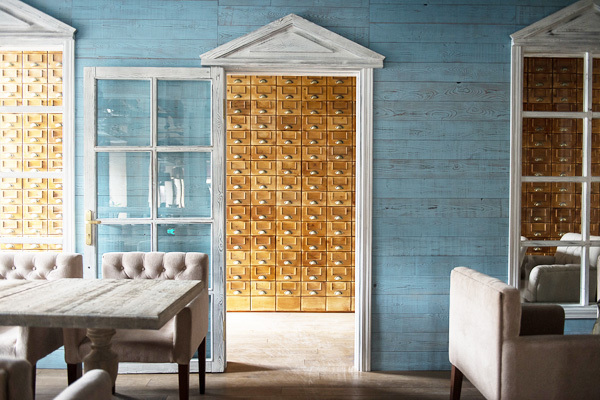 Второй этаж ресторации отведен под обеденную зону с открытой кухней. Работать над пополнением библиотеки зала сможет каждый посетитель, обменивая свои издания на комплимент от проекта. В зале уже оборудована американская терраса с мякгими качелями и деревянная картотека. Последняя  не просто украшение интерьера, потому что все дизайнерские вещи здесь практичны. В картотеке, например, будут  хранить рецепты блюд от гостей, горожан и туристов. Раз в месяц лучший рецепт опробуют на фестивальной кухне, а потом включат в меню.