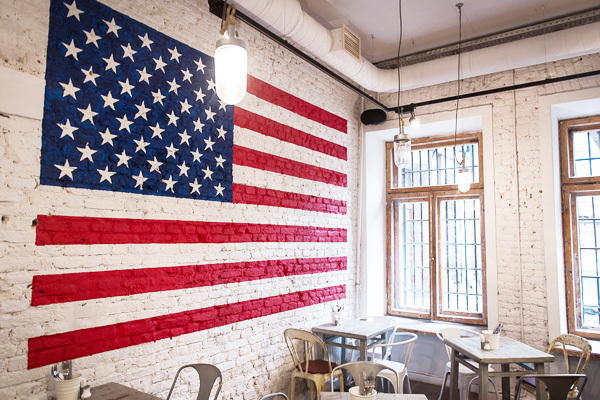 На первом этаже будет располагаться кафе с демократичными ценами (средний счет около 500 рублей) и самообслуживанием. При входе будет зона кондитерской с пирогами и тортами, в центре  салатная и ланч-станция, а в отдельной комнате с американским флагом  бургерная.