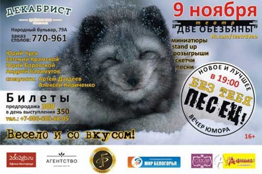 9 ноября в 19:00 театр «Две обезьяны» приглашает в паб «Декабрист» на вечер юмора «Без тебя ПЕСЕЦ!» с новыми шутками, яркими образами, неожиданными развязками, розыгрышами.