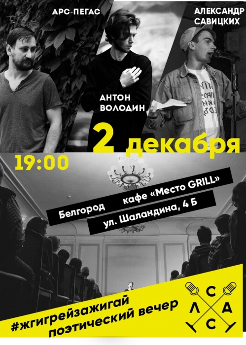 Как сообщает сайт 2DO2GO, 2 декабря в 19:00 в кафе «Место GRILL» три молодых поэта Арс-Пегас из Москвы, Антон Володин из Санкт-Петербурга и белгородец Александр Савицких прочтут свои стихи.