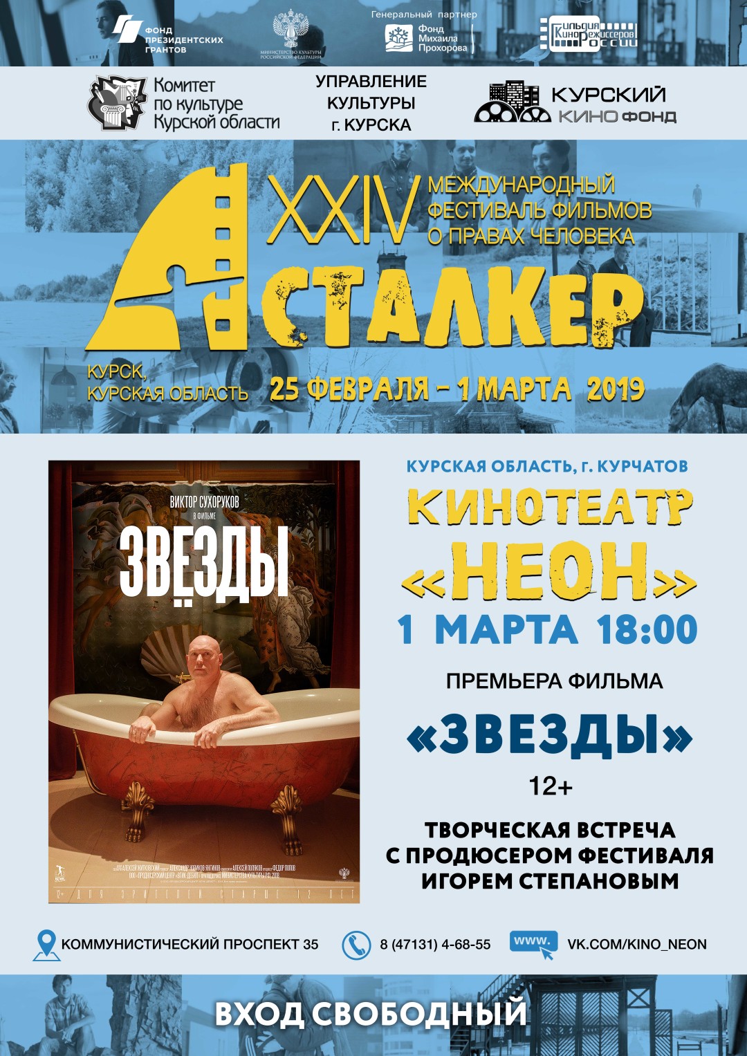 Кинотеатр «Неон», г. Курчатов, Коммунистический пр., 35 − премьера художественного фильма «Звезды», творческая встреча с продюсером фестиваля Игорем Степановым.