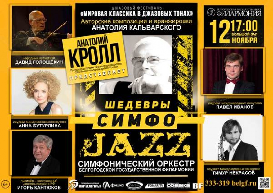 11 и 12 ноября в 17:00 в Большом зале Белгородской государственной филармонии состоится джазовый фестиваль «Мировая классика в джазовых тонах». Он пройдет в два дня: «Коррида Биг-бэндов» и «Шедевры Симфо-джаза». Продюсер и художественный руководитель – джазмен с 50-летним опытом, народный артист России Анатолий Кролл.