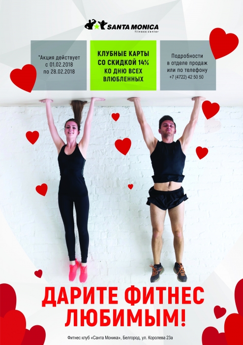 В преддверии Дня Святого Валентина фитнес-центр «Санта Моника» подготовил приятный бонус для своих клиентов. Весь февраль в продаже клубная карта для влюбленных в фитнес со скидкой 14%!
