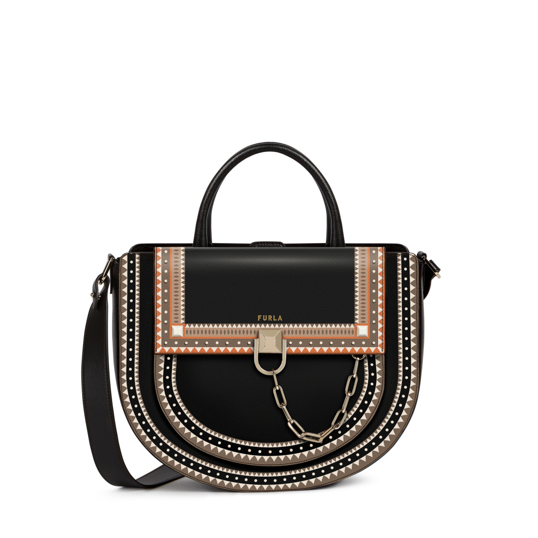 Сумка Furla Miss Mimi преобразилась к летнему сезону: теперь в ней отчетливо читаются фольклорные мотивы, которые очень идут ее строгой геометричной форме.