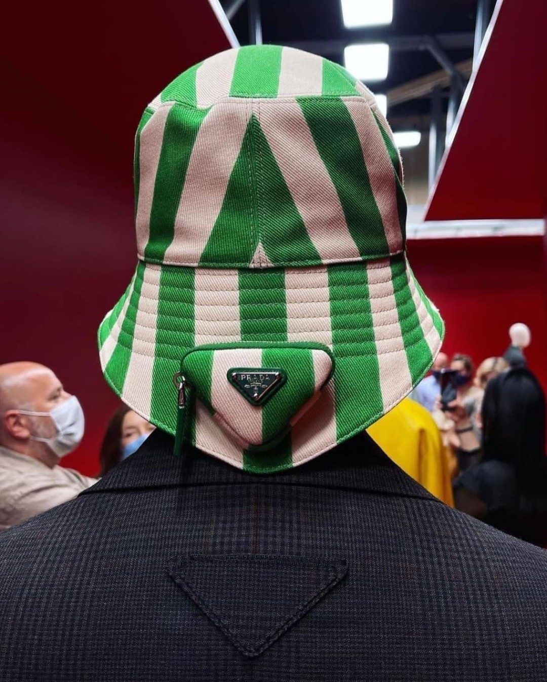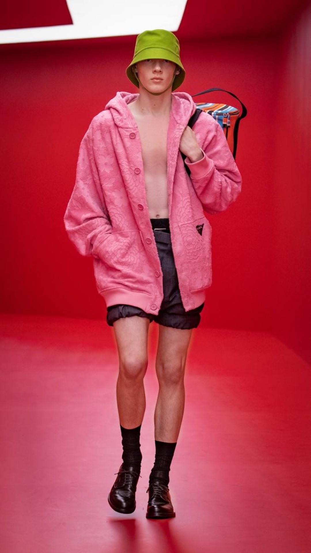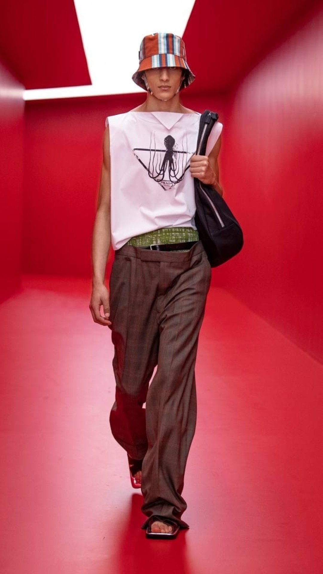 Главным аксессуаром новой мужской коллекции Prada стали панамы — с треугольными полями, которые отсылают к форме логотипа модно дома. Сам лого на головных уборах тоже есть, а на некоторых из них, еще и прорези для солнцезащитных очков. Сумки также стали треугольными, и их, опять же, украсил логотип бренда. Кроме логомании, в особое место в коллекции занимает морская тема — моносерьги-осьминоги и принты на рубашках в виде морских жителей. Цветовая палитра состоит из черного, небесно-голубого, синего, терракотового, красного, болотного и желтого оттенков.