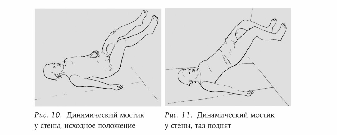 - Согнув колени под прямым углом, упритесь стопами в стену и, удерживая положение, напрягите ноги, как будто тянетесь пятками к полу, — так вы задействуете подколенные сухожилия и ягодичные мышцы. При этом продолжайте поднимать и опускать таз, перенося вес с верхней на нижнюю часть спины и обратно. Почувствуйте, как напрягаются мышцы с внутренней стороны ног и массируются мышцы спины вдоль позвоночника.