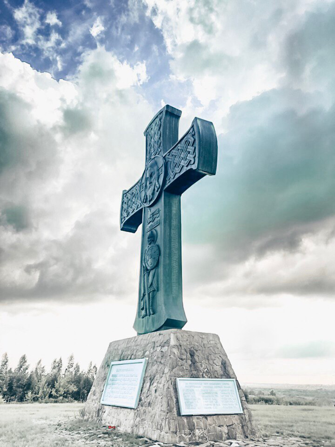 Поклонный крест установлен на месте сражения курских ополченцев с ордой нагайцев Большого Улуса. Это сражение скульптор В.М. Клыков считал незаслуженно забытым. Памятник выполнен из кованой меди, а его высота составляет 11 метров.