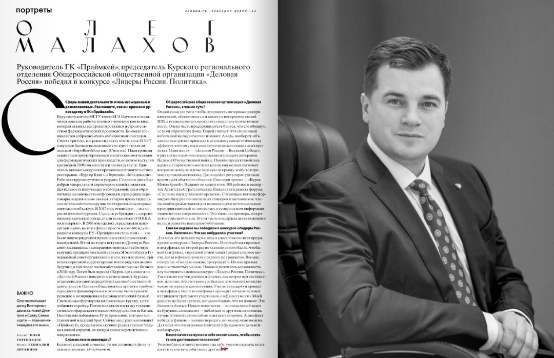 Олег Малахов — руководитель ГК «Праймкей», председатель Курского регионального отделения Общероссийской общественной организации «Деловая Россия» победил в конкурсе «Лидеры России. Политика».