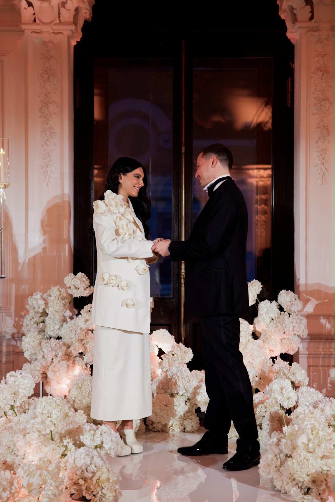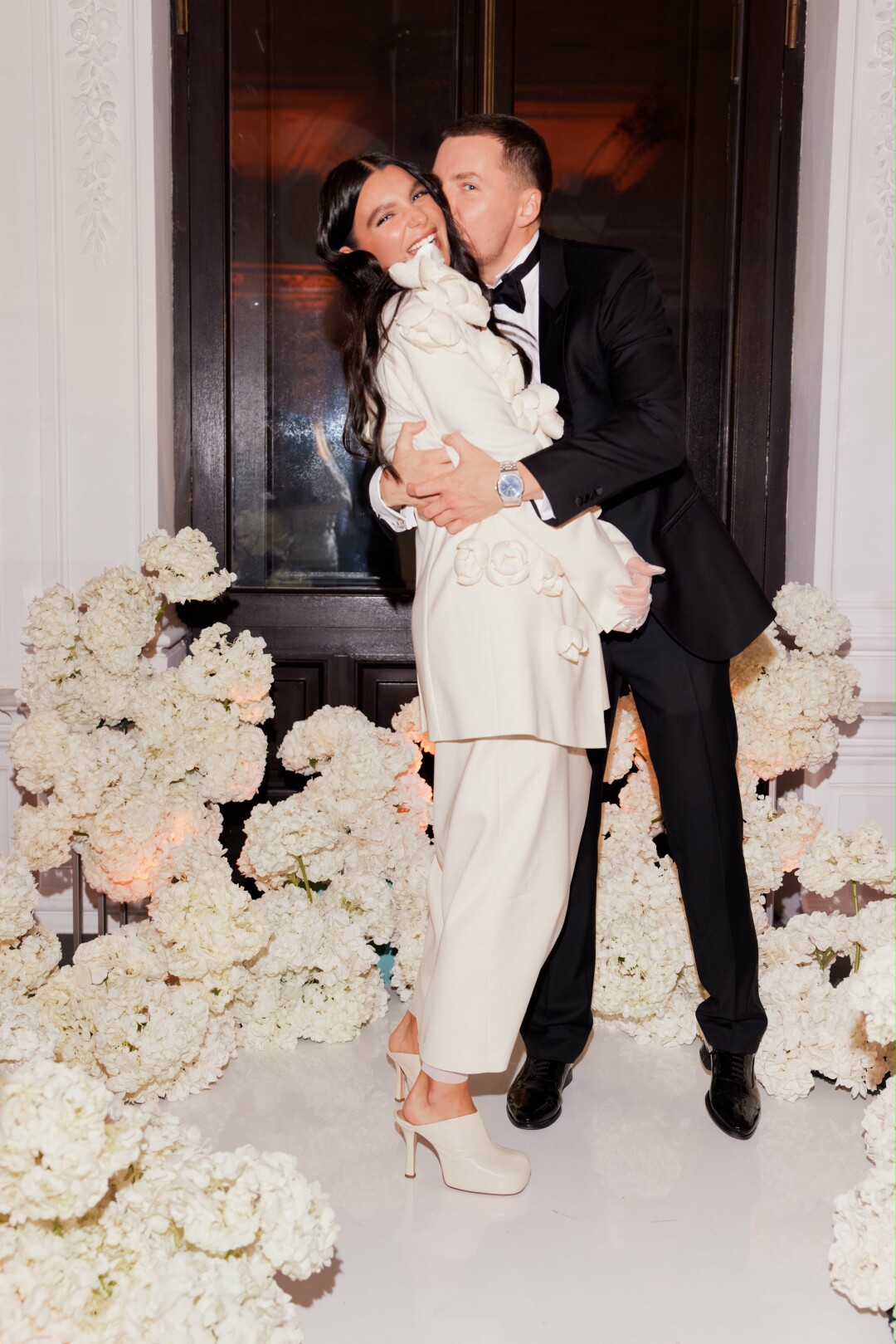 Поиск наряда — отдельная тема. За неделю до регистрации началась паника: ни в ЦУМе, ни в каких-то других торговых центрах мне не удалось найти тот самый образ. Но зато, оббегая все точки продаж свадебных нарядов столицы, я сделала интересное открытие: в России очень любят черный цвет. Особенно зимой: белого катастрофически мало. Учитывая, что это не было полноценной свадьбой — платья в пол мне не хотелось. Короче, сложная задача (смеется). На помощь пришла лауреат премии «ТОП50. Самые знаменитые люди Петербурга» Татьяна Кочнова, чьи наряды уже выгуливали Лиза Боярская и Настя Ивлеева. С ней мне очень повезло: если обычно требуется где-то две недели для пошива платья по размерам клиента, то в TATYANA KOCHNOVA ATELIER комплект из жакета с цветами и юбки успели сделать за шесть (!!!) дней. Образ прилетел ко мне из Петербурга за полдня до церемонии!