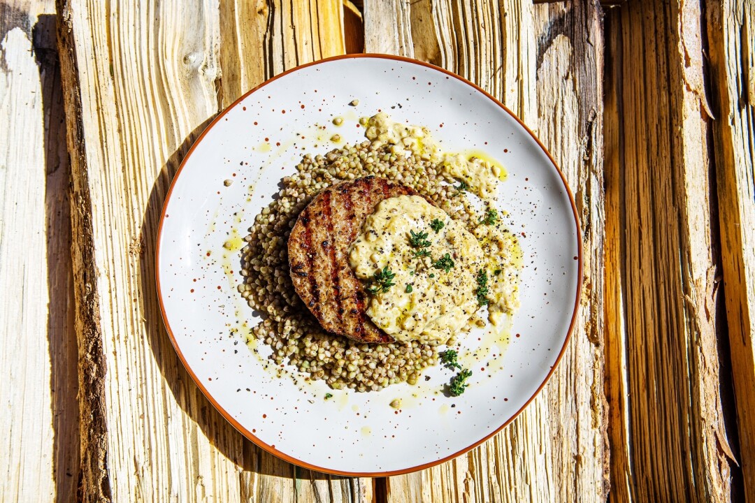 - Полейте бифштексы грибным соусом и подавайте с зеленой гречкой.