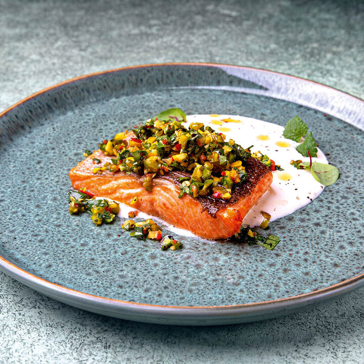 Запеченная форель с сальсой из фисташек от Марии Дементьевой, шеф-повара ресторана Saro, Санкт-Петербург