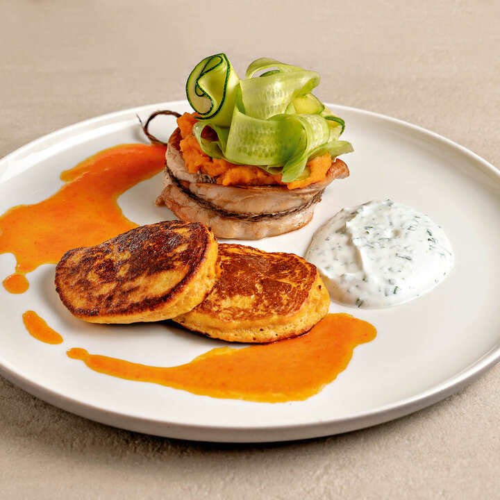 - Формы из кролика обжарьте на сливочном масле со всех сторон до золотистой корочки и выложите на тарелку. Сверху положите немного пюре батата, слайсы цукини и огурца, а рядом оладьи, йогуртовый соус и пару ложек апельсиново-морковного.