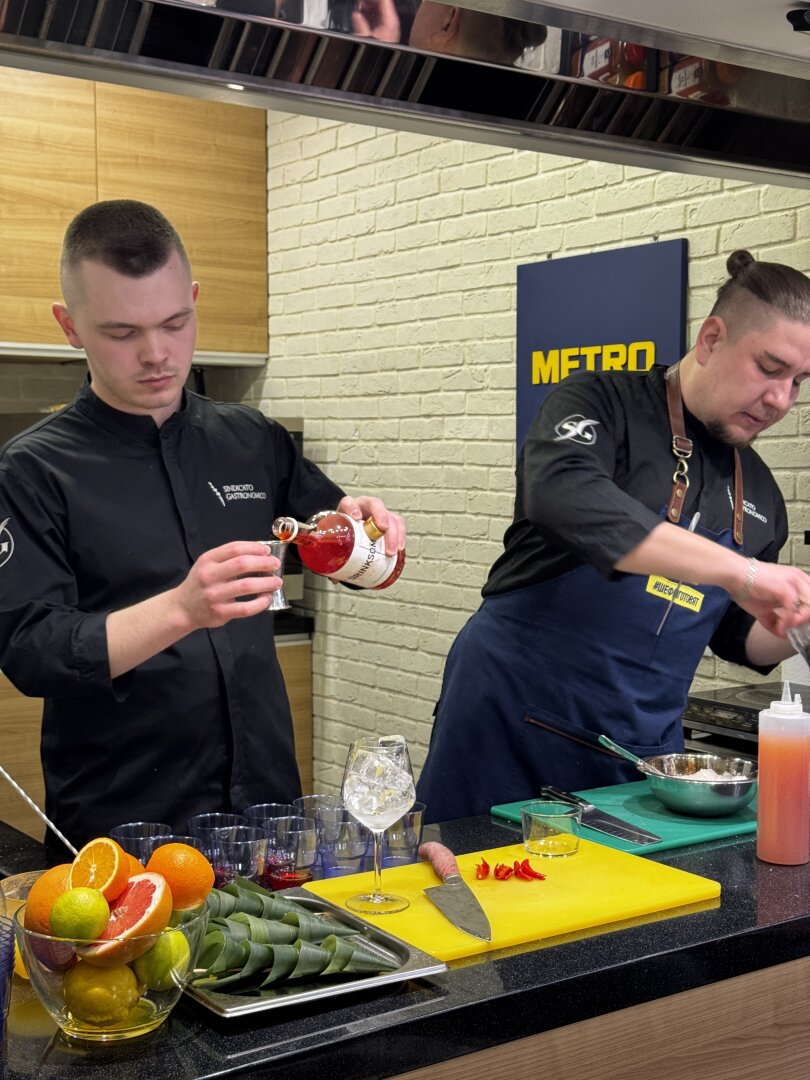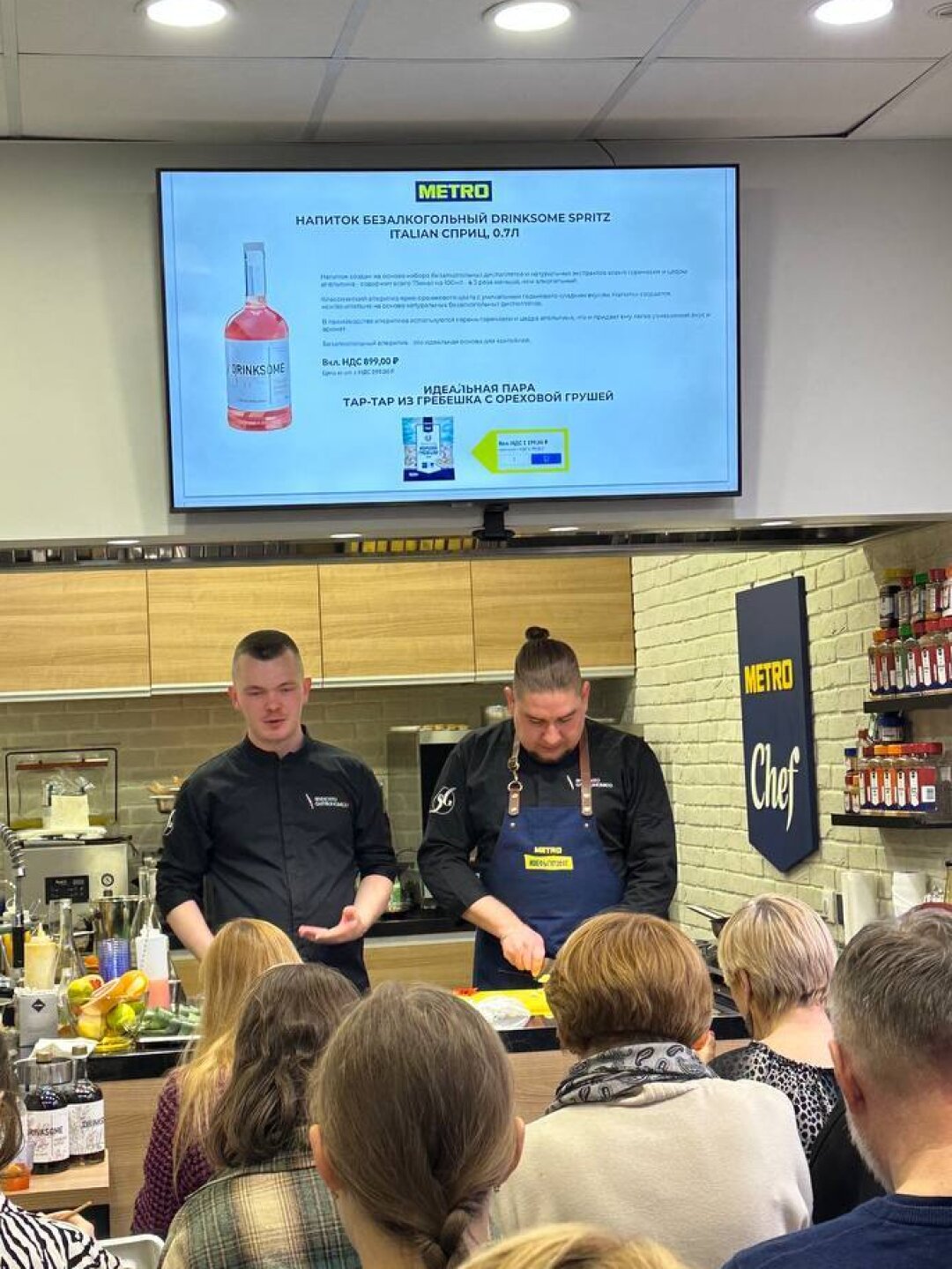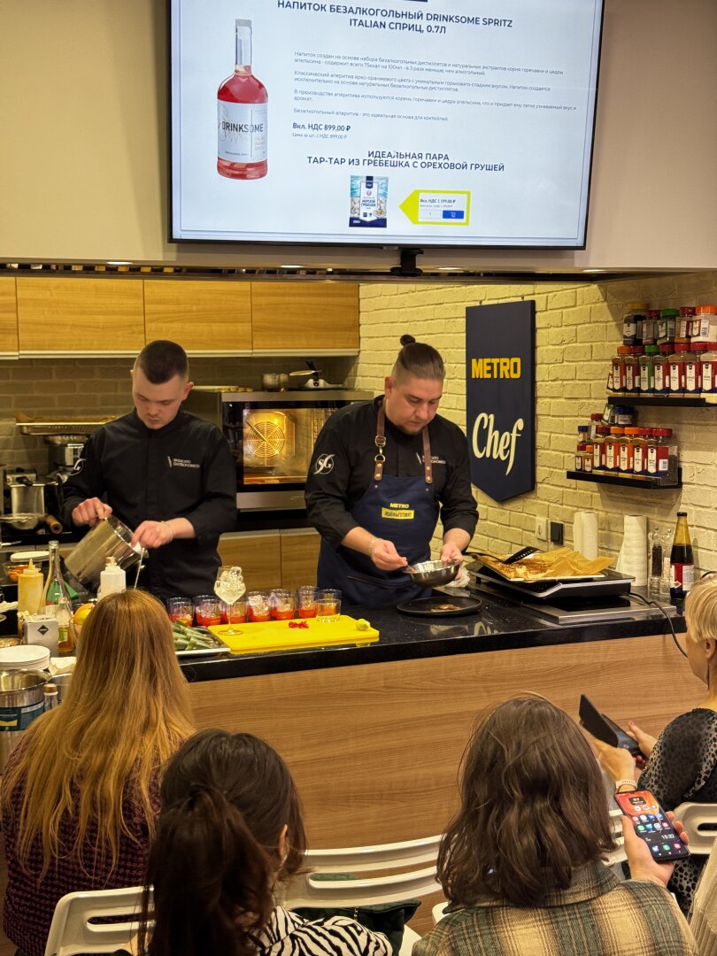 Фархад Замалдинов и Раиль Гайнуллин подготовили для участников мастер-класса четыре варианта пейринга (блюдо и безалкогольный напиток, которые удачно дополняют друг друга). Для приготовления позиций использовались продукты из СТМ МЕTRO: мороженое манго-сорбет, филе морского гребешка, свиная шея, сливочное масло. В качестве основы для коктейлей выбрали безалкогольные джин, ром, игристое и сприц.