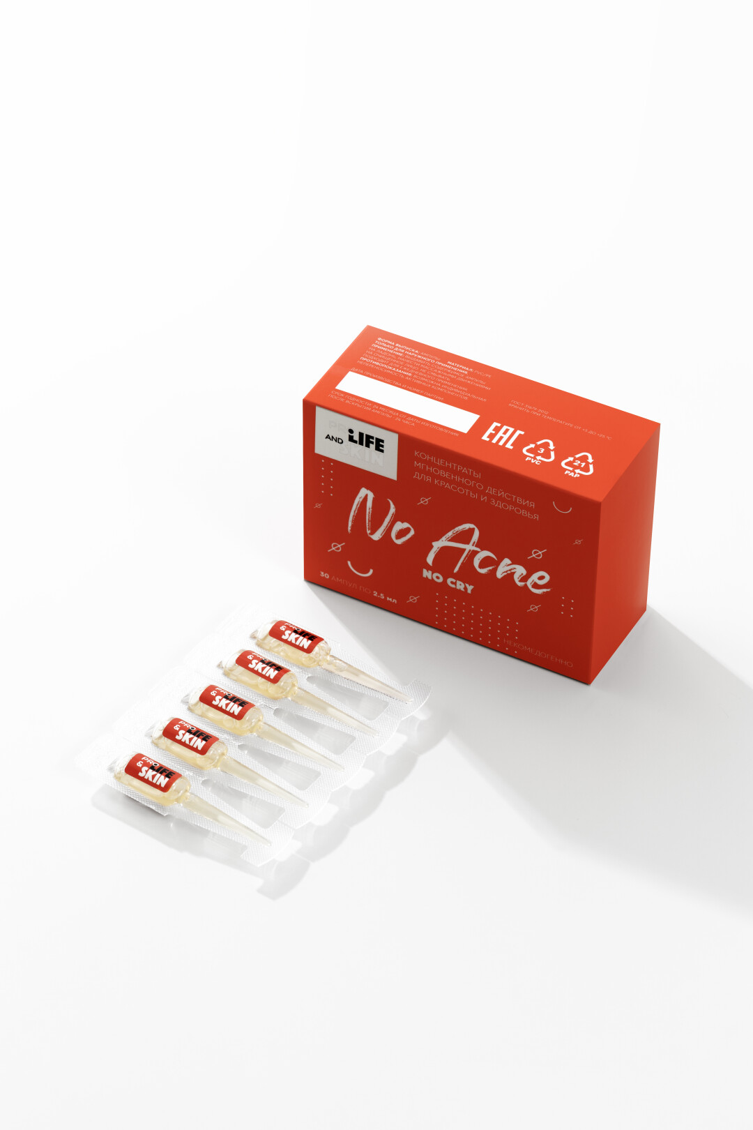 Первый продукт — концентрат No Acne No Cry разработан для людей с проблемной кожей, склонной к воспалению. Средство регулирует работу сальных желез, успокаивает кожу и справляется с воспалением за два дня благодаря комплексу активных компонентов. Так метилсульфонилметан регулирует деятельность сальных желез, стимулирует процесс восстановления, препятствует образованию рубцов постакне, экстракт кипрея подавляет рост бактерий p.acnes, успокаивает кожу, гликолевая кислота бережно обновляет кожу, ниацинамид (витамин В3) улучшает микроциркуляцию в коже, поддерживает баланс микробиома, снимает покраснение, сужает поры, минипорил оказывает себорегулирующее действие и разглаживает поверхность кожи, экстракт магнолии благодаря антибактериальным свойствам снимает покраснение, воспаление.