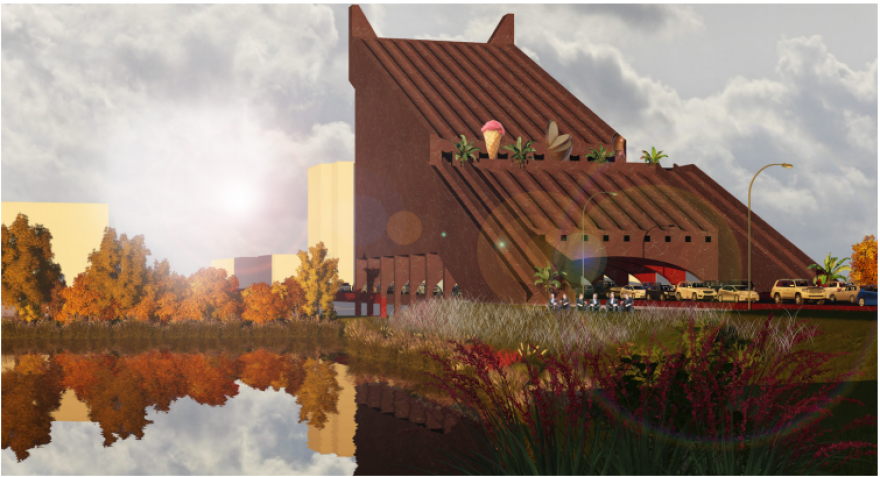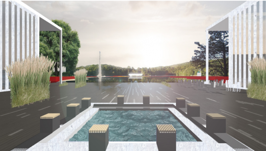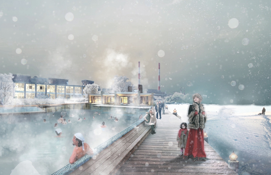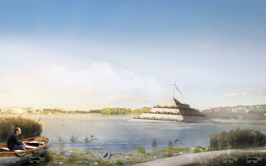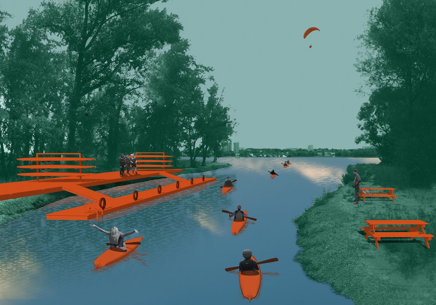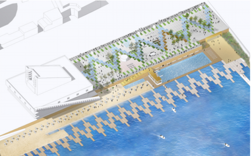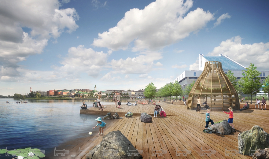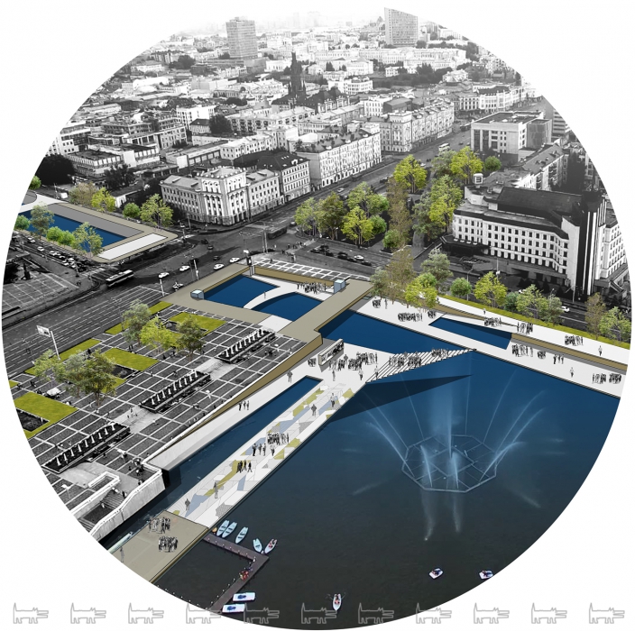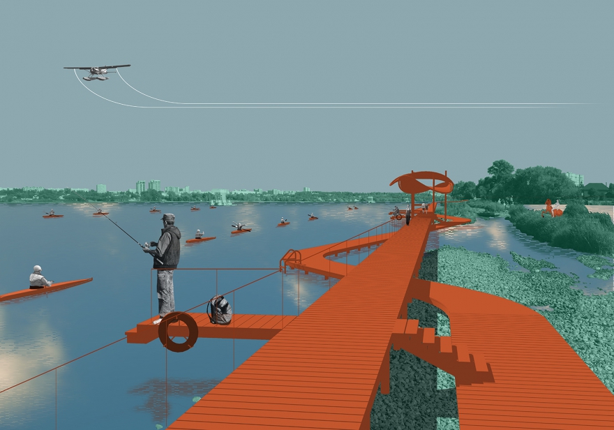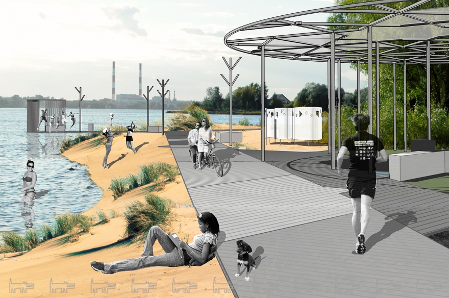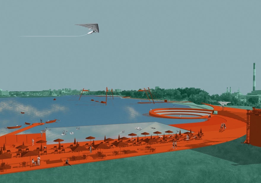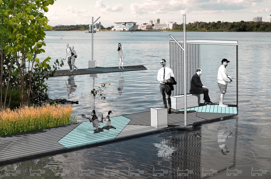 Консорциум IND architects + BASE (Россия - Франция). Для очистки воды концорциум предлагает устроить плавающую платформу - бассейн, вода в которой берется из озера, и очищается при помощи растений. Также появляется плавающая фитомашина в виде пирамиды, которая также фильтрует воду. Для первой очереди проекта команда предложила детскую площадку в парке Тысячелетия, клуб у воды «Айсберг», деревянный настил и пляж у театра Камала и арт-квартал на базе завода Пецтольд.