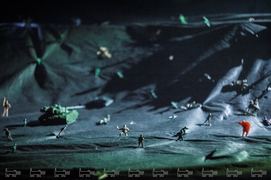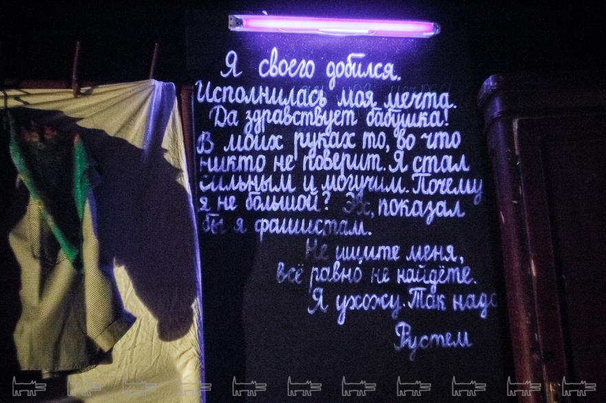 Страшновато детям будет на «Приключениях Рустема». Рассказ о мальчике, который стал невидимым, подан близко к тексту. На сцене из видимых персонажей - только милиционер, появляющийся в середине спектакля. Во всем остальном вместо людей - размахивающие рукавами костюмы, отодвигающиеся стулья, хлопающие двери, стук клавиш пианино. Чудесная ночь с поеданием волшебного папоротника, давшего невидимость - это театр теней. А война - самолетики под потолком, падающие на сцену фонарики, игрушечные фигурки солдат и танков. И все это - под музыку Тихона Хренникова-младшего. Таким образом, создателям удалось избежать чрезмерного пафоса, а через условность и намеренно инфантильный взгляд показать восприятие войны так, как, верно, хотел Адель Кутуй. Хотя, безусловно, необходимо еще поработать над тем, что тени смотрелись выразительно, в словах милиционера звучала хоть какая-то тревога, а одежды родителей в диалога не дергались хаотично.