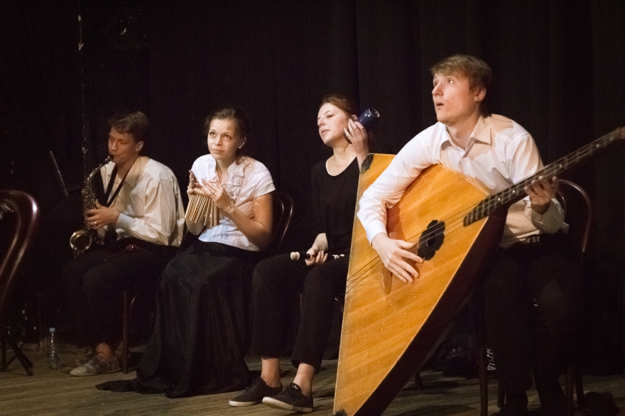 Другие два спектакля выстроены по более любопытным методам. В чеховских рассказах (среди них - классические «Злой мальчик», «Радость») сюжет двигают не только актеры, но и музыка, которую играет (порой, все же, фальшиво) половина труппы, заставляя героев впадать то в раж, то в сон. При этом из декораций - только подвижные занавески и стулья для музыкантов. Актеры сверхэмоционально отыгрывают сцены, так что не смеяться невозможно. Хотя завлит Камаловского театра Нияз Игламов и обратил внимание, что им нужен хороший преподаватель по технике речи - ведь выступать им придется не в театрах, а в сложных по акустике школьных залах. Да еще и с самым сложным на свете зрителем. Спектакль по Чехову зрителю могли уже видеть в виде эскиза на лаборатории «Город Арт-Подготовка».