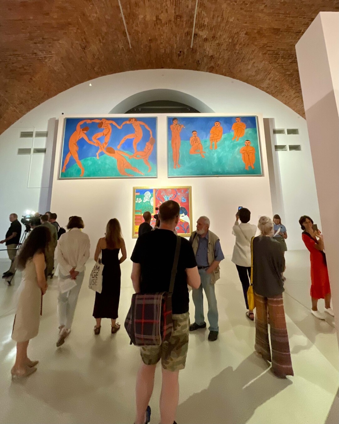 Хотя в Эрмитаже это пространство последнее (но не по значению), гости Щукина в первую очередь попадали как раз на большую лестницу, где были вывешены панно Анри Матисса «Танец» и «Музыка». Это было довольно смело для его времени. Щукин писал Матиссу: «Москва – это Азия. А люди здесь не любят ню». Впрочем, света на лестнице было немного, поэтому рассмотреть работы оказывалось сложно. На выставке «Танец» и «Музыка», напротив, видны сразу — и практически из любой точки зала. Это доминанты всей экспозиции. Но лестницы тут нет, это обозначение условное.