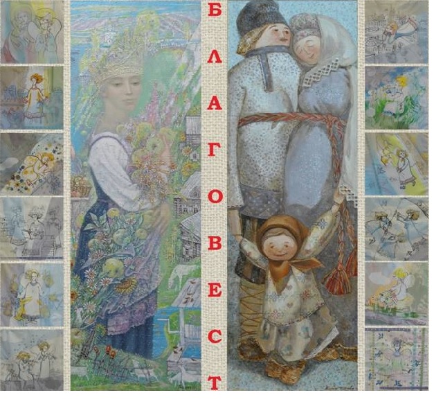 Возрождение национальной идеи повлекло рост интереса к старине и исконным народным традициям. Выставка «Благовест» – прекрасный шанс увидеть красоту этих традиций. Авторы «погружают» в самобытный мир народного искусства и обычной жизни. Тема семьи и Домостроя ярко прослеживается в работах Елены Титовой («Семья», «Вместе», «Иван-да-Марья»). Виталий Скобеев размышляет об истоках духовности. Например, его творческий цикл «Сад Марии» воспевает чистоту души и красоту женского образа. Тема небесной радости ангельской жизни живет в работах Галины Орловой (серия «Ангельские думки»).