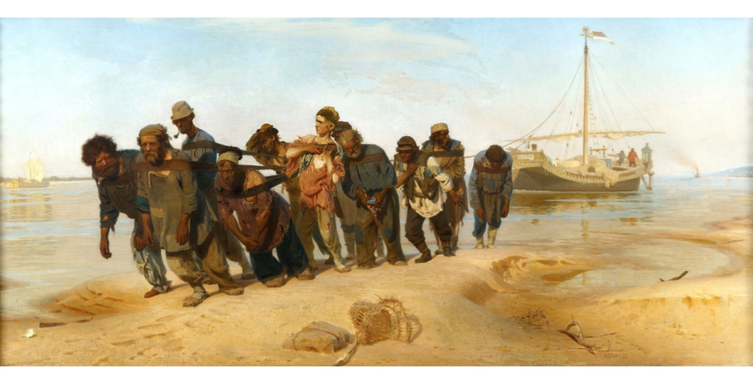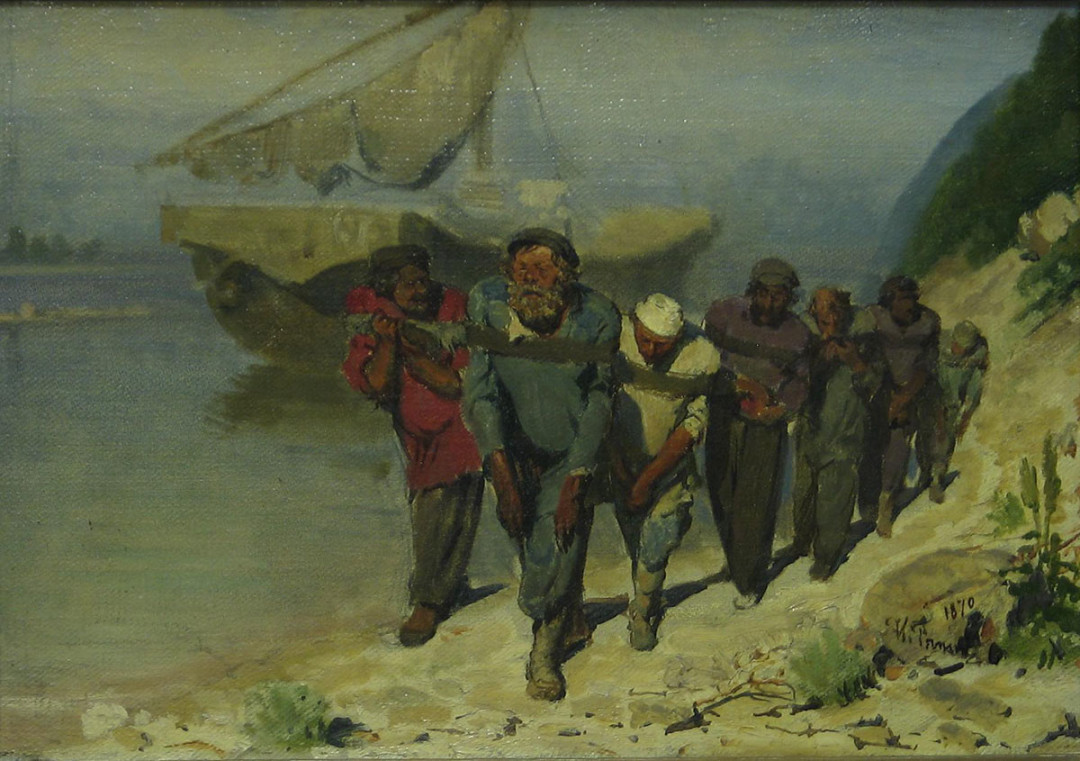 25-летний Репин днями и ночами готовится к конкурсу на Малую золотую медаль Академии на тему «Иов и его друзья» — ветхозаветный мученик, потерявший детей и имущество, предстает перед старыми друзьями. Сокурсник зовет художника писать этюды на Неву — за город: природа, красивая публика, девушки. «Я уже боюсь даже глаза останавливать: втянут, не оторвать потом, будут грезиться и во сне...». Тогда Репин впервые видит бурлаков: «Я никогда еще не был на большой судоходной реке и в Петербурге, на Неве, ни разу не замечал этих чудищ "бурлаков" (у нас в Чугуеве бурлаком называют холостяка бездомного). <...> О боже, зачем же они такие грязные, оборванные?» В тот год появился замысел картины, которую он начнет писать после первой поездки на Волгу в 1870 году. На академическом просмотре эскизов и этюдов в конференц-зале Академии художеств великий князь Владимир Александрович пообещал заплатить 3000 рублей за исполнение будущей картины с сюжетом на тему труда бурлаков. В последствии он повесит полотно в своей бильярдной. Работа займет целых три года. Впервые петербургская публика увидит ее на экспозиции вещей, отобранных для отправки на Всемирную выставку в Вену. Академист Федор Бруни, автор знаменитого «Медного змия», назвал «Бурлаков» «Великой профанацией искусства». Чиновники восклицали, мол, давно уже никто не использует такой варварский способ перевозки грузов. Одним из главных защитников полотна выступил Стасов, который в письме редактору «Санкт-Петербургских ведомостей» писал: «Взгляните только на "Бурлаков" г. Репина, и вы тотчас же принуждены будете сознаться, что подобного сюжета никто еще не смел брать у нас и что подобной глубоко потрясающей картины из народной русской жизни вы еще не видали, даром что и этот сюжет, и эта задача уже давно стоят перед нами и нашими художниками». Критик лукавит: на ту же тему в 1866 году создал картину В.В. Верещагин, а за два года до репинских «Бурлаков» свое видение каторжного труда на Волге представил Алексей Саврасов.