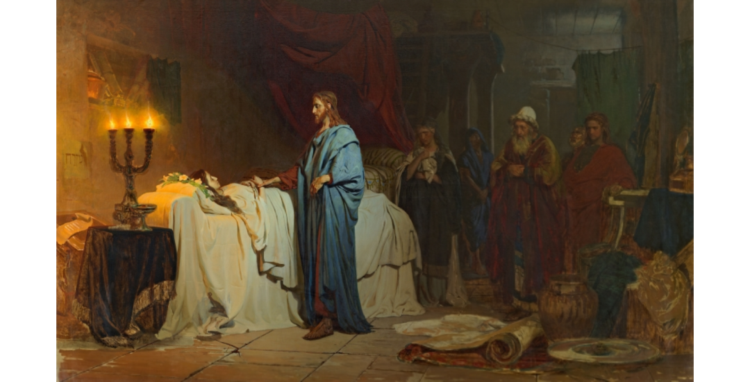 Картина была написана к конкурсу на Большую золотую медаль Академии — она давала право на поездку заграницу или «пенсионерство». Конкурсной темой был библейский сюжет (изображение сцен из «народной жизни» в Академии было нонсенсом) — Иисус воскрешает 12-летнюю дочь правителя синагоги. Как вспоминал Стасов: «Он долго не хотел браться за нее, предпочитая лучше пропустить конкурс, чем делать что-то не идущее к его вкусам и понятиям — порядочная редкость между художниками! <...> Но вдруг ему пришла в голову мысль, которая сделала возможным исполнение картины, даже и на классический сюжет. Он вспомнил сцену из времени своего отрочества: ту минуту, когда вошел в комнату, где лежала только что скончавшаяся его двоюродная сестра, молоденькая девочка. В его памяти возникло тогдашнее чувство, полумрак комнаты, слабо мерцающий красный огонь свечей, бледное личико маленькой покойницы, закрытые глаза, сложенные тощие ручки, худенькое тельце, выделяющееся словно в дыму, важная торжественность и глубокое молчание кругом — и вот из этих, выплывших теперь ощущений, глубоко запавших прежде в юной душе, он задумал создать свою картину». Репин решительно меняет подход к восприятию сцены: основное действие переносится в левую часть изображения, нарушается фризовая постановка фигур с целью выделения главного смыслового центра, замыкающегося на прикосновениях рук стоящего Христа и лежащей дочери Иаира. Интересно сравнивать свето-теневые решения и колорит репинской картины с другой конкурсной работой на тот же сюжет в исполнении Василия Поленова. Медали, кстати, получили оба художника.