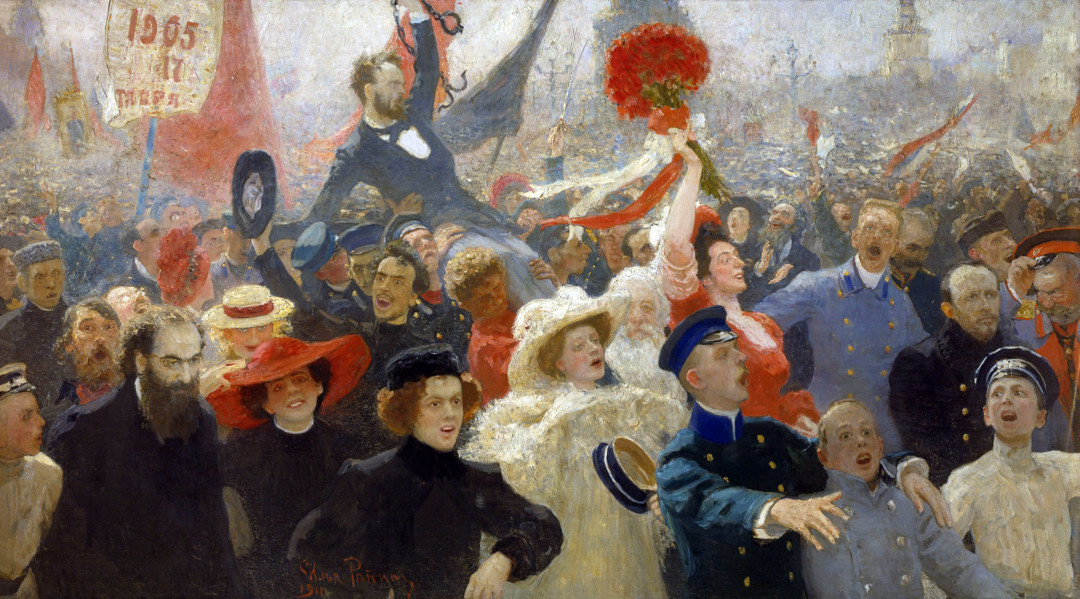 17 октября 1905 года император Николай II подписал манифест «Об усовершенствовании государственного порядка», в котором были обещаны «незыблемые основы гражданской свободы». Эта новость накалила до предела страсти участников всероссийской политической стачки. Репин создал картину, находясь в «Пенатах» спустя несколько лет после событий, о которых в 1905 году писал: «Слава богу! Слава богу! Свобода завоевана. Я боюсь теперь исторического возмездия. Угнетенный раб через Прометея овладел огнем. Страшно делается за будущее, если дикарь -- одурелое войско -- захочет отомстить...» По деталям портретов в картине можно понять не только сословную принадлежность каждого человека, но и назвать конкретные имена некоторых персонажей — критика Владимира Стасова, филолога Мстислава Прахова, актрису Лидию Яворскую, историка литературы Семена Венгерова. Философ Василий Розанов писал о полотне: «Сколько понимания, сколько верности! Конечно, все жившие в 1905-1906 годах в Петербурге скажут о картине: "Это — так! Это — верно!" Несут на плечах маньяка, с сумасшедшим выражением лица и потерявшего шапку. "До шапки ли тут, когда конституция". Лицо его не ясно в мысли, как именно у сумасшедшего, и видны только «глаза в одну точку» и расклокоченная борода» <...> Такая же «без мысли» и поднявшая букет высоко кверху еврейка, лет 35, в середине толпы, в центре картины. Дальше «поднятого букета» она вообще ничего не думает. Она вся - эффект, поза и единичный выкрик».