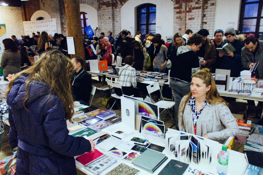 Заходим в ЦСК, получаем красный браслет-проходку за 100 рублей (стоимость входа) и сразу натыкаемся на коллективную выставку «Кинотеатр повторного фильма» - для посетителей она стала своеобразным бонусом. В этом же зале расположился лекторий, где презентовали книгу «Искусство с 1900 года: модернизм, антимодернизм, постмодернизм» Екатерина Иноземцева, куратор Музея современного искусства «Гараж» и Михаил Котомин, директор и главный редактор издательства Ad Marginem. Здесь же в роли спикеров себя попробовали художник Ирина Корина и дизайнер Дмитрий Мордвинцев, а также под занавес первого дня фестиваля обсудили феномен small press в России.