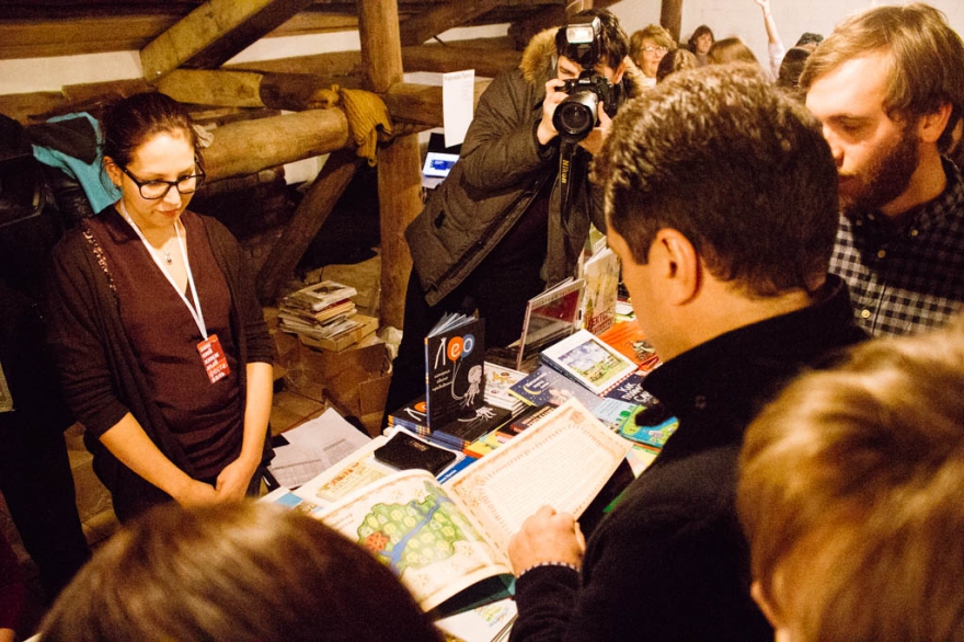 Но и всего второго этажа для события такого масштаба оказалось мало. «Смена» предоставила для фестиваля и пространство чердака, где создали детскую зону, а также свое продолжение нашла выставка «Кинотеатр повторного фильма». Тех, кому от 3 до 10, учили создавать книжки-раскладушки и занимались химией. Родители, пока их юные дарования осваивали новый материал, выбирали занимательные книжки. Среди них был представлен свеженький гид «Путешествие по Татарстану» от креативного агентства Evolution. На продажу выставили всего 50 экземпляров, поскольку официальная презентация пройдет только 23 декабря. Но один гид забрал с собой мэр Казани Ильсур Метшин.