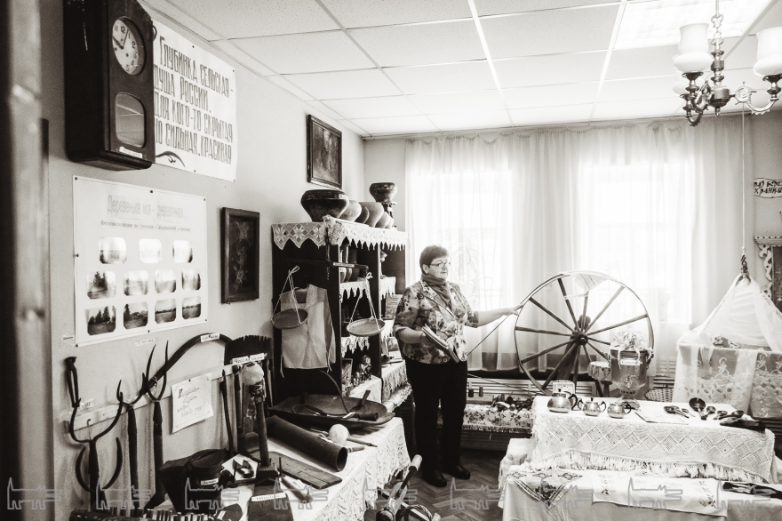 Она начинает рассказывать о том, что у нее здесь есть, и не может остановиться. Останки каких-то животных и черепки от посуды с наконечниками стрел, найденные местными мужиками в Булгаре. Поделки детей, некоторые из которых уже женились. Целый музей села, с наличниками, прялками, серпами, словом, всей утварью - разумеется, настоящей, принесенной из дома. Отдельная детская комната. В конце (разумеется) библиотекарша вручает книгу со стихами, изданную в «Идель-Пресс» тиражом 1000 экземпляров. «Я сама из села Ромодан приехала, 30 лет назад, замуж вышла», - и тут же начинает читать стихотворение о муже.