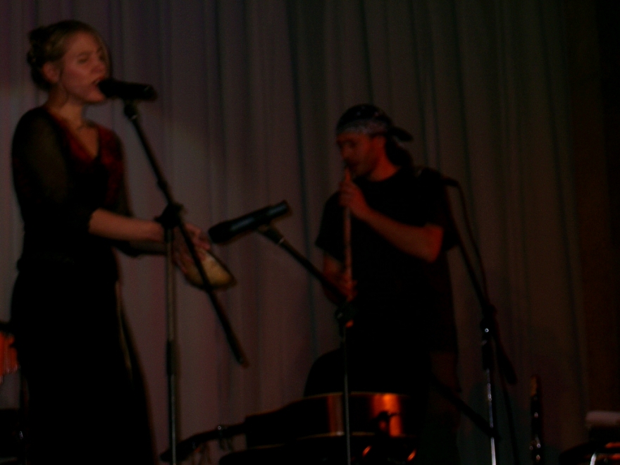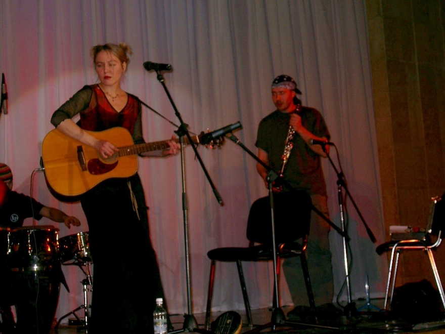 Диспозиция на сцене такова: справа - Сергей Клевенский (кларнет, а также всяческие экзотические дудочки), в глубине - перкуссионист Максим Покровский и контрабасист Эндрю Таннер. Слева - обладатель кубка баянистов Айдар Гайнуллин. Зуля - гитара, треугольник и калимба.