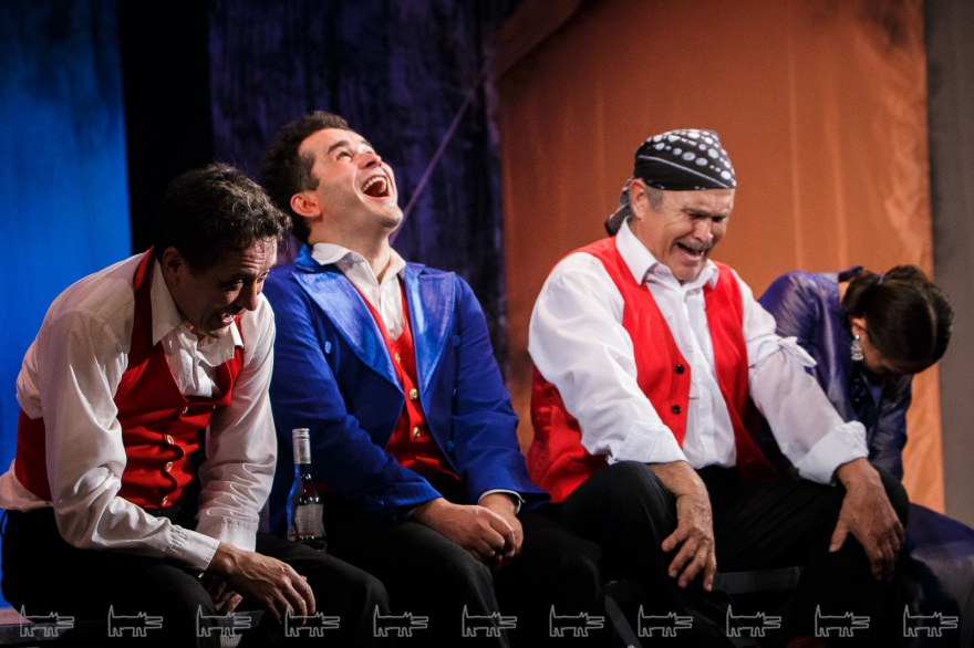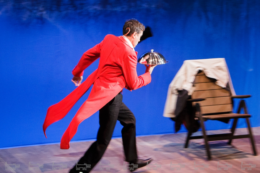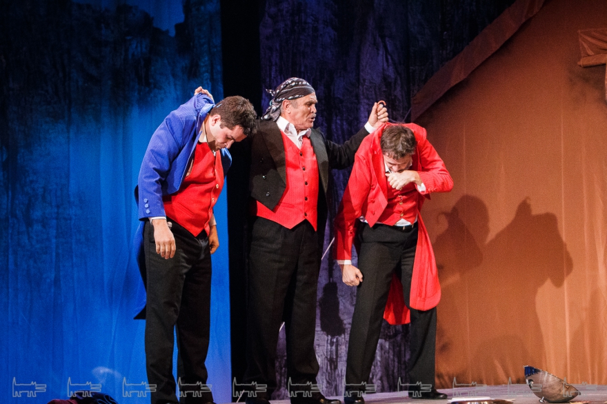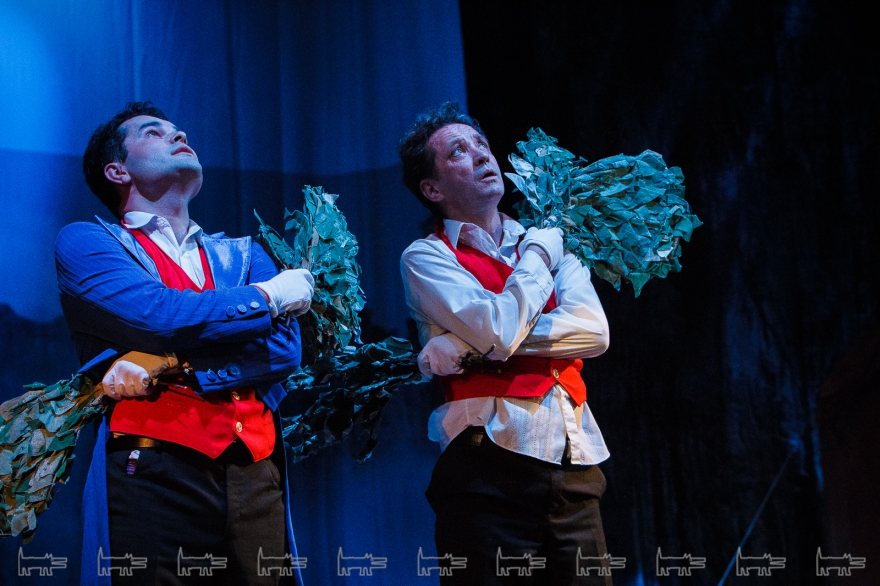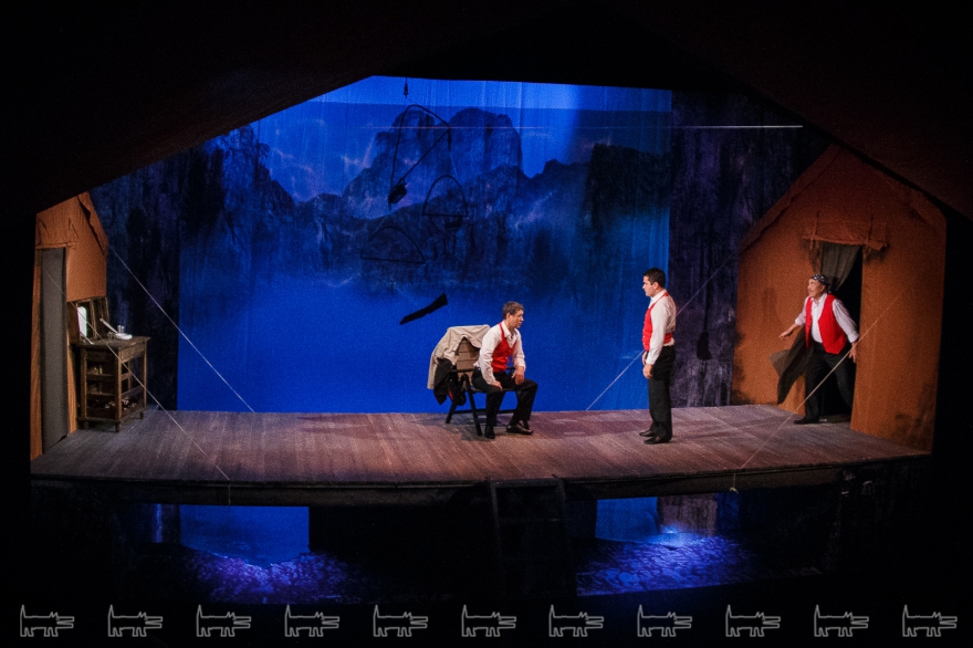 Спектакль получается абсолютно узнаваемым, но при этом сюрреалистичным. Его место действия - невероятно красивый уголок природы, главное в котором - потрясающего вида горное ущелье. Около него стоят два одинаковых шатра - кухня и зал для высоких гостей, которые приехали за день до охоты. Им прислуживают трое - бесконечно преданный самой идее поклонения чинам, считающий, что даже смерть не может стать причиной для остановки праздника Атабай (Наиль Дунаев), ироничный и практичный Руфин (Ильдус Габдрахманов) и только пробующий силы в этой ипостаси Раян (Алмаз Гараев). Весь спектакль они носятся по сцене с подносами, дерутся, когда хочется им - и когда это нравится хозяевам. А также обсуждают баб и кино, выясняют, все ли трое здесь находятся для того, чтобы их «приметили». Ну, практически Труффальдино, Сганарель и Фигаро. Только лишенные внятных амбиций.
