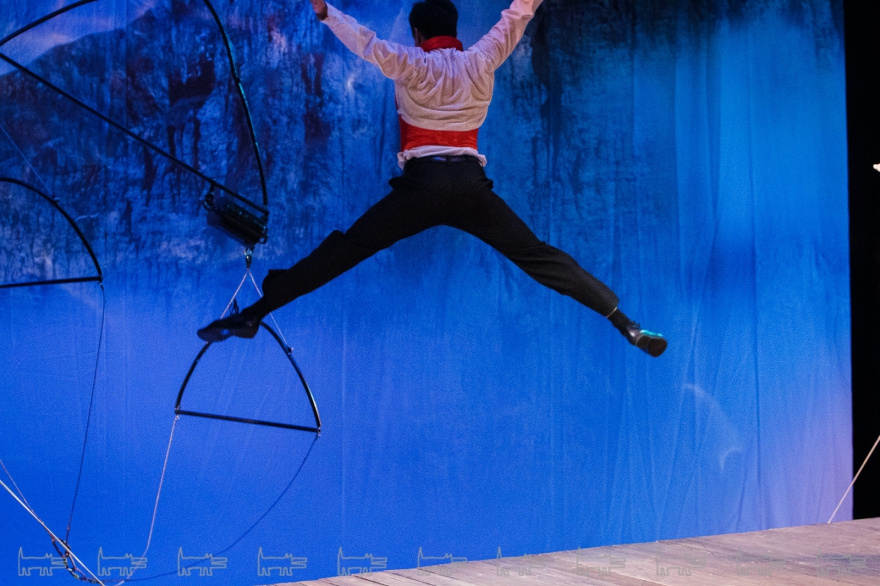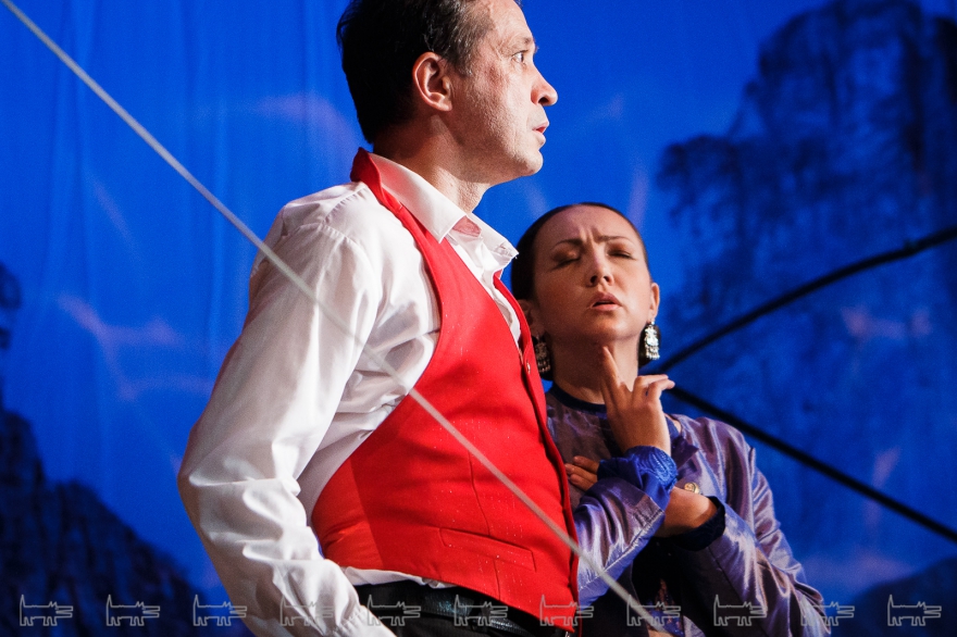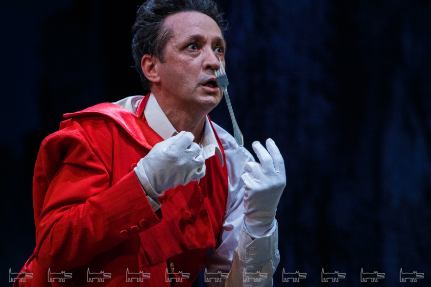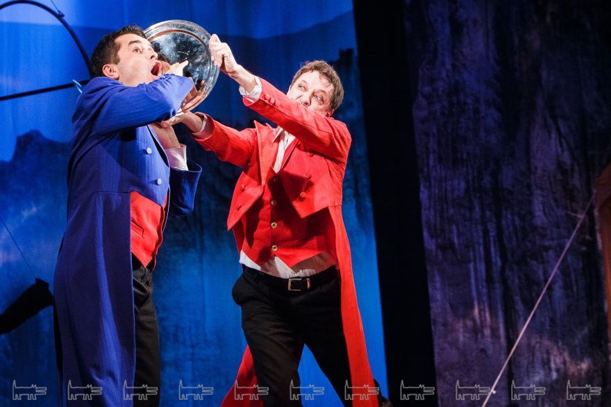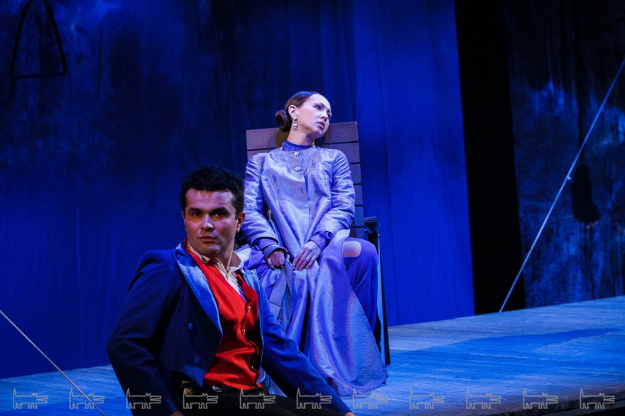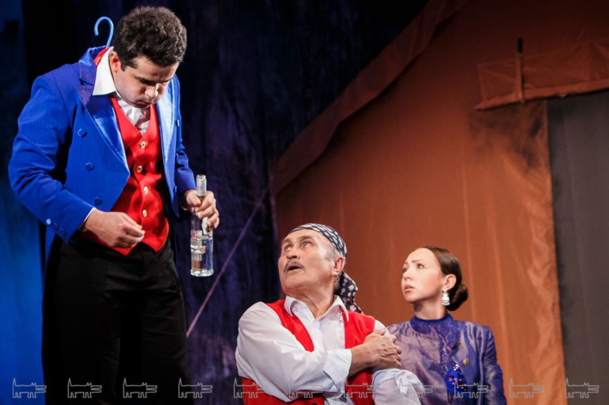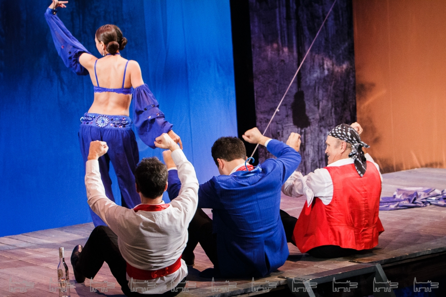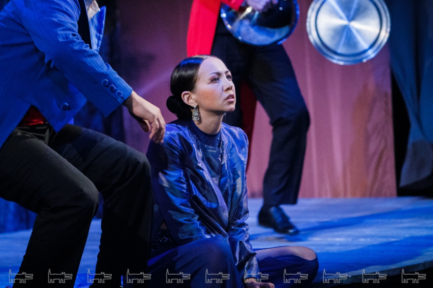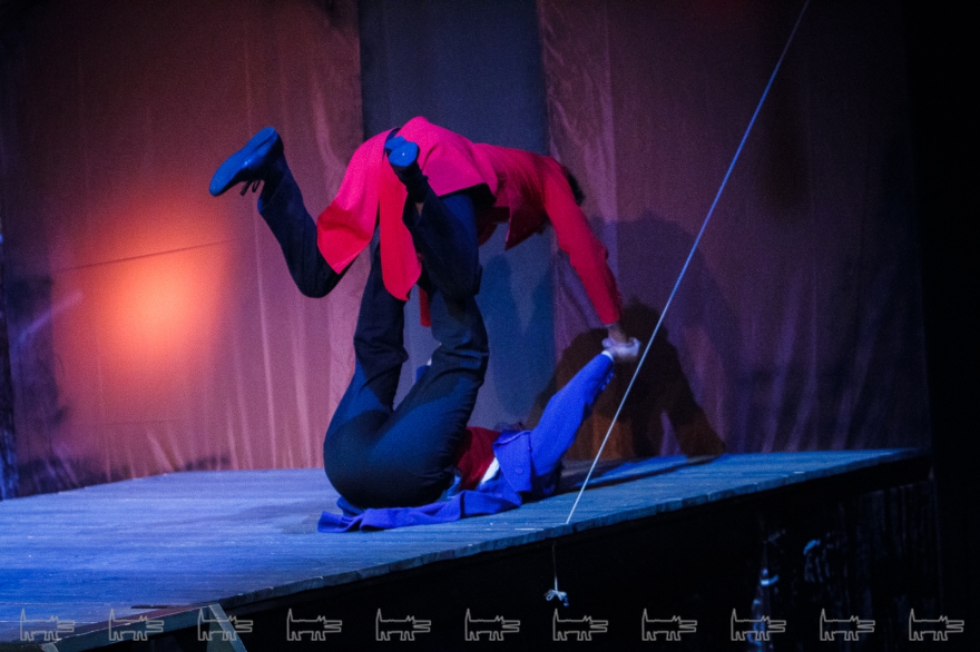 Словом, картина неприглядная. При этом слуги и женщина - образы явно символистские, а не реальные. Они, мол, даже в аду будут прислуживать, стараясь добавить кипяточку. Чуть дальше - и начнется гротеск. Порой это переходит в откровенное тыкание зрителю - мол, смотрите, актеры носят фраки, не вынимая плечиков, а Атабай настолько яростно произносит речи про почитание сильных мира сего (без какого-либо двойного дна), про командность, что того и гляди, завопит татарскую мантру «Будем вместе, будем едины!». Изящнее выглядит решение любовной линии, в котором артисты перевоплощаются в акробатов, парящих над сценой в танце.