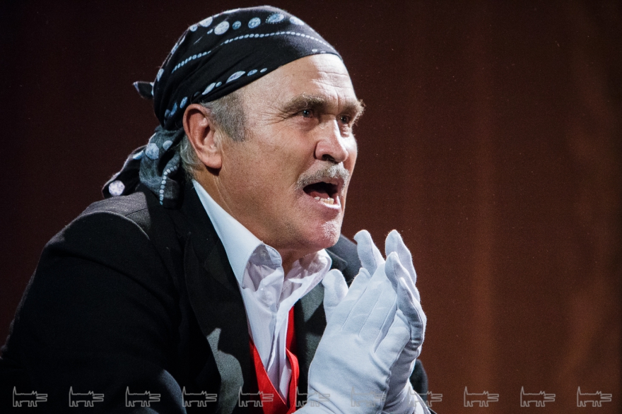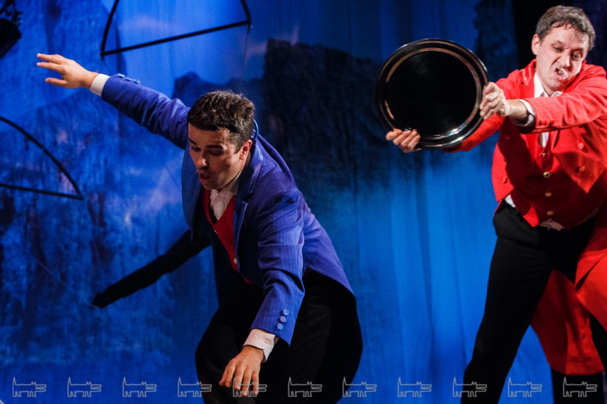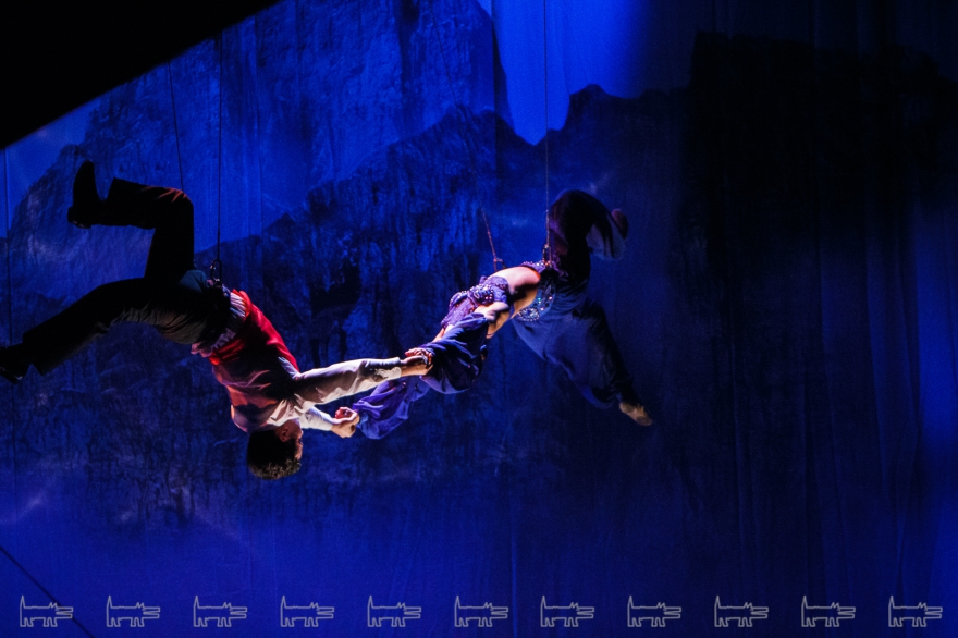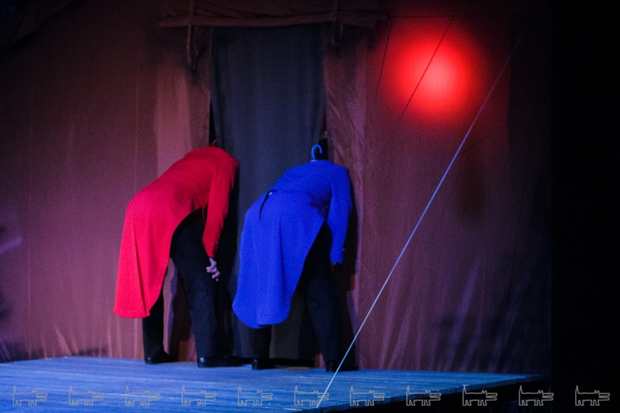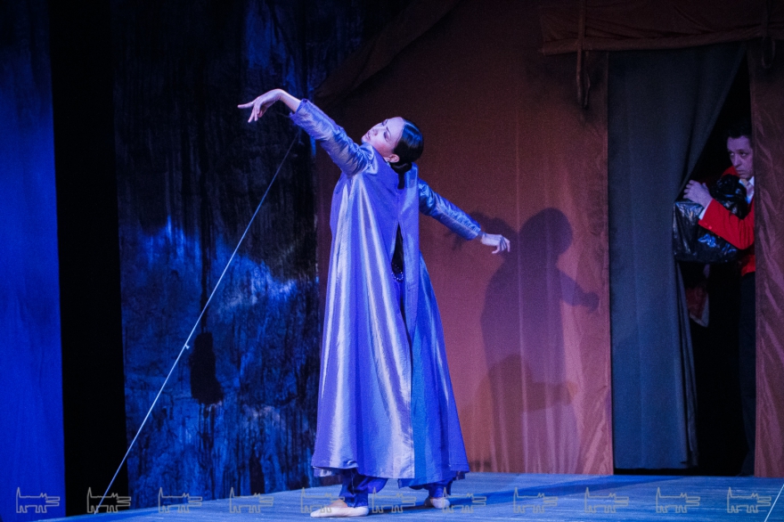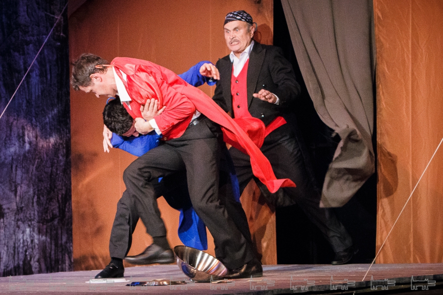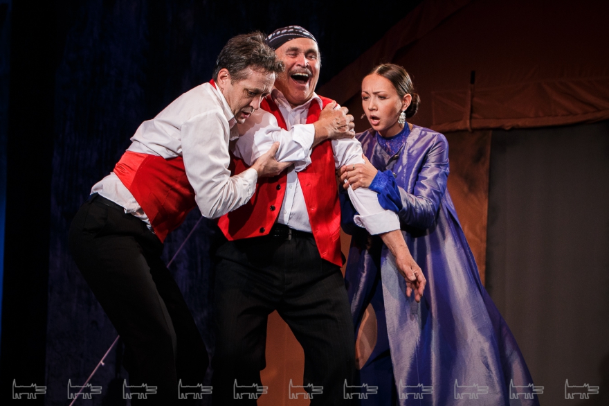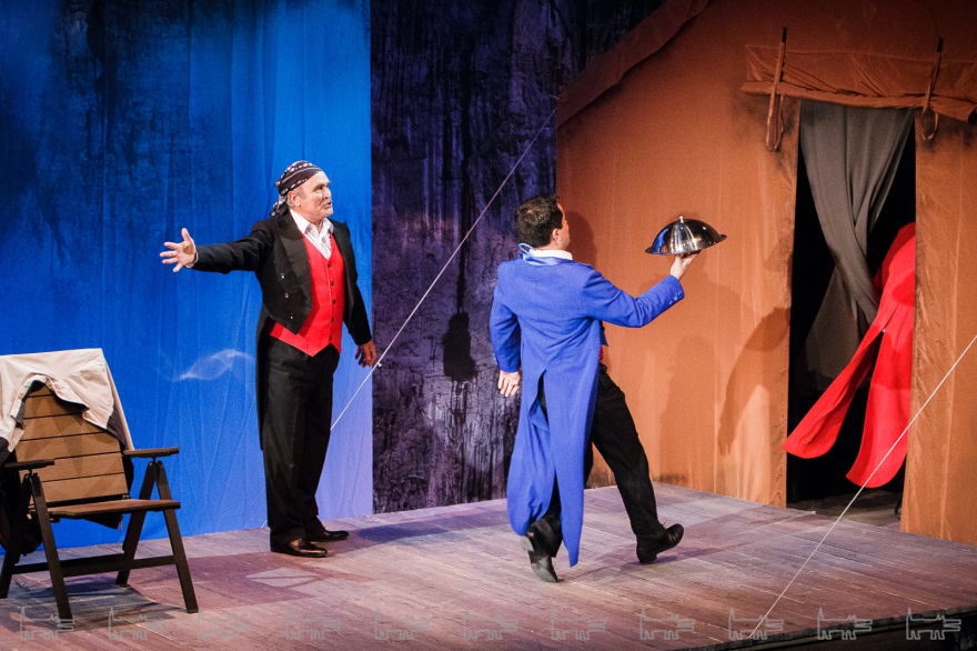 Словом, картина неприглядная. При этом слуги и женщина - образы явно символистские, а не реальные. Они, мол, даже в аду будут прислуживать, стараясь добавить кипяточку. Чуть дальше - и начнется гротеск. Порой это переходит в откровенное тыкание зрителю - мол, смотрите, актеры носят фраки, не вынимая плечиков, а Атабай настолько яростно произносит речи про почитание сильных мира сего (без какого-либо двойного дна), про командность, что того и гляди, завопит татарскую мантру «Будем вместе, будем едины!». Изящнее выглядит решение любовной линии, в котором артисты перевоплощаются в акробатов, парящих над сценой в танце.