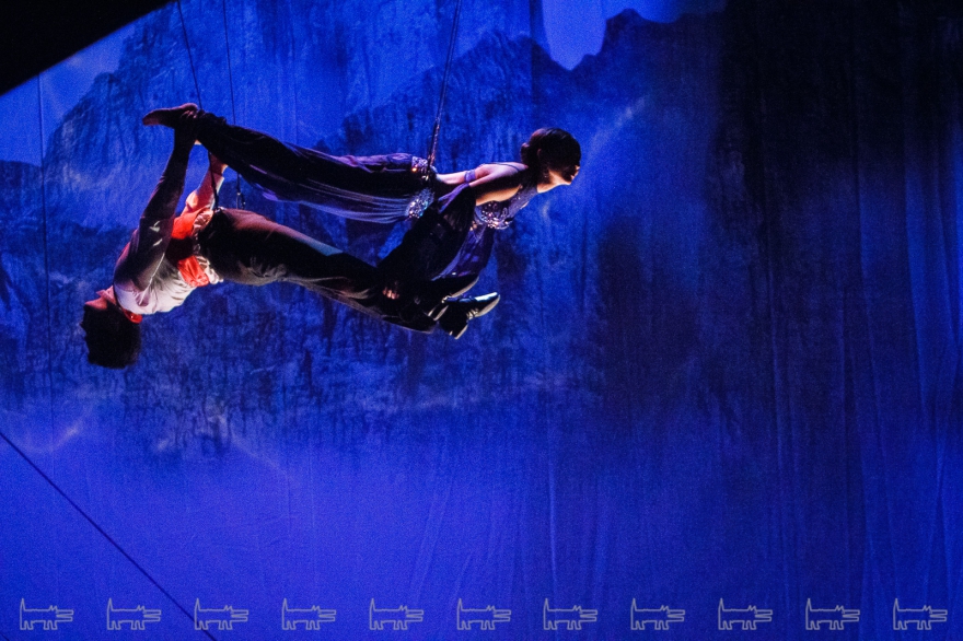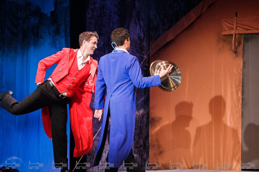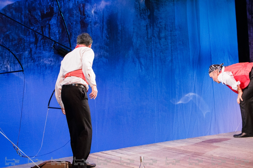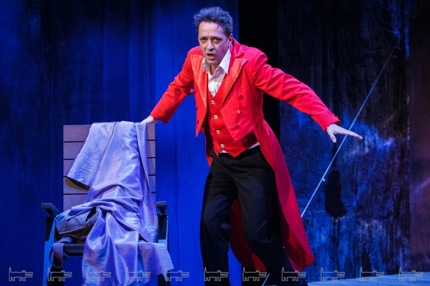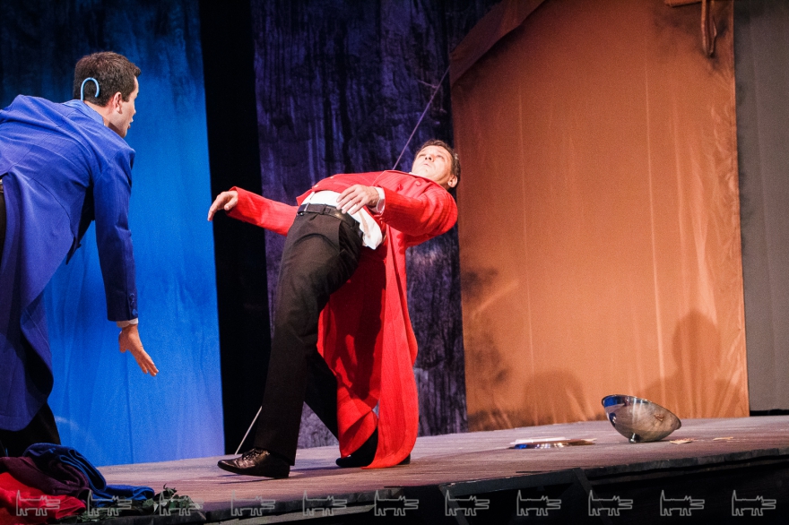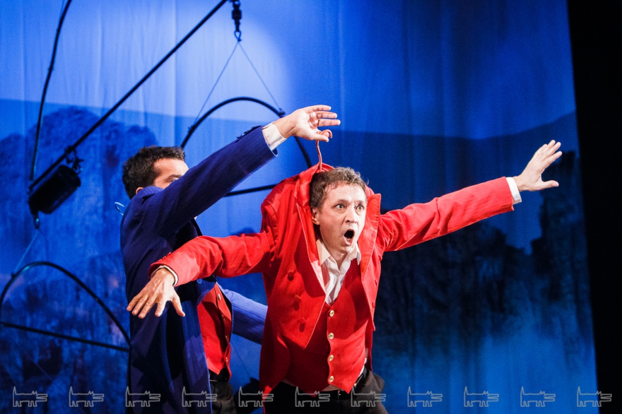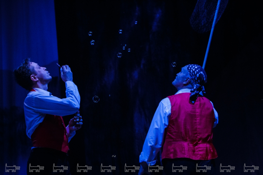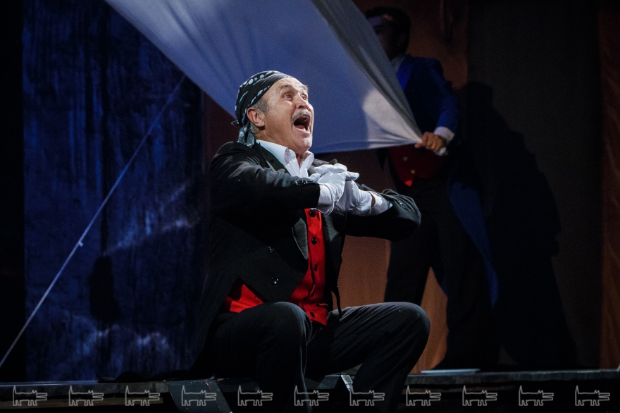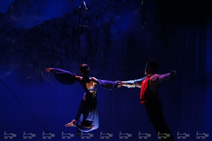 Словом, картина неприглядная. При этом слуги и женщина - образы явно символистские, а не реальные. Они, мол, даже в аду будут прислуживать, стараясь добавить кипяточку. Чуть дальше - и начнется гротеск. Порой это переходит в откровенное тыкание зрителю - мол, смотрите, актеры носят фраки, не вынимая плечиков, а Атабай настолько яростно произносит речи про почитание сильных мира сего (без какого-либо двойного дна), про командность, что того и гляди, завопит татарскую мантру «Будем вместе, будем едины!». Изящнее выглядит решение любовной линии, в котором артисты перевоплощаются в акробатов, парящих над сценой в танце.