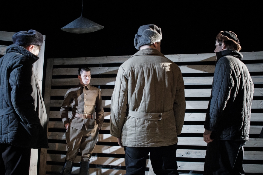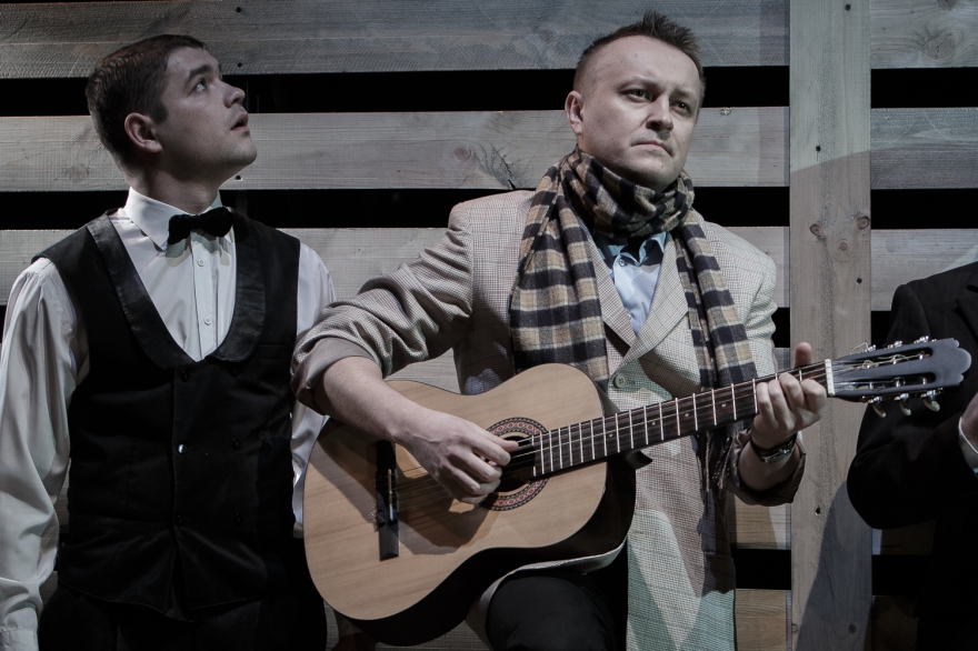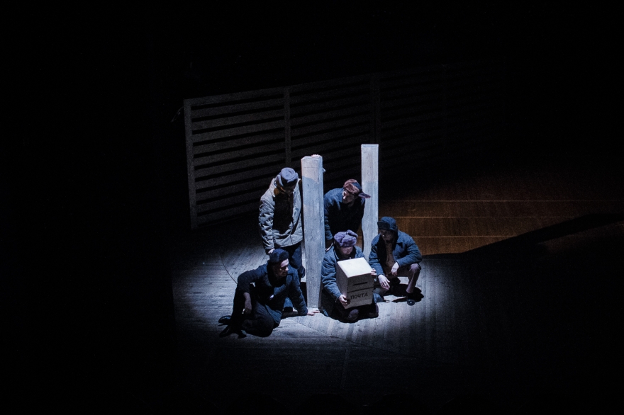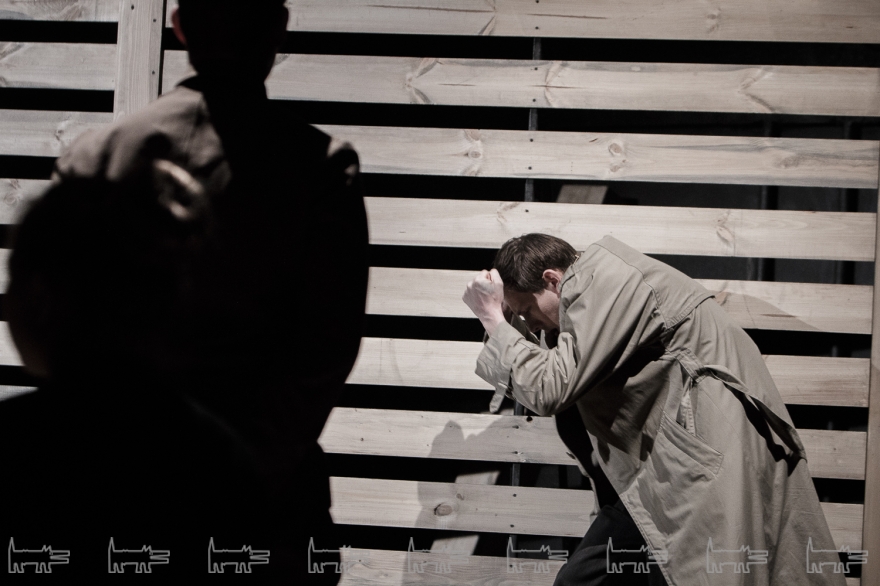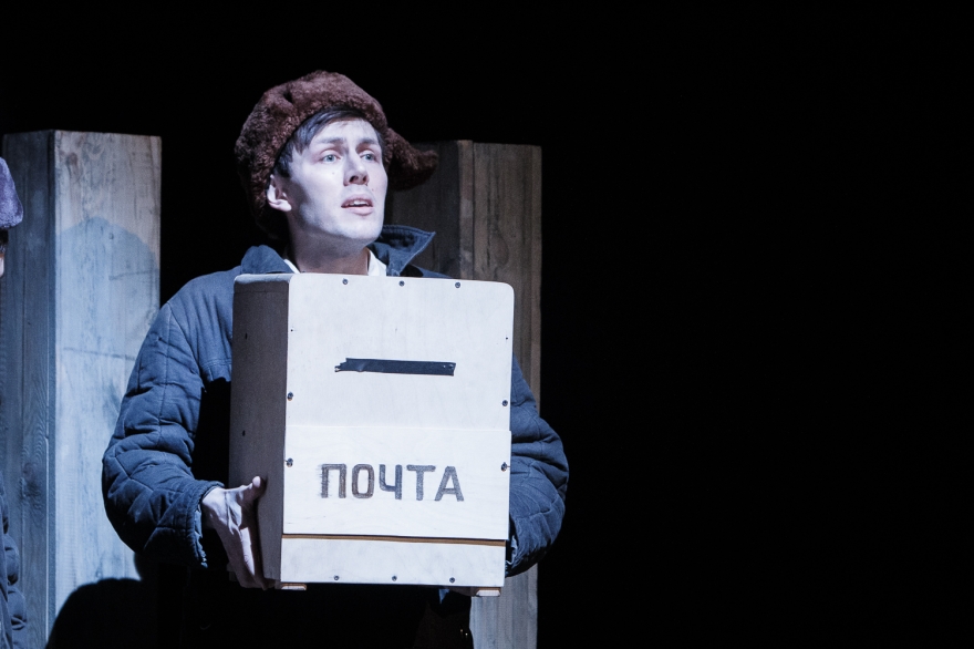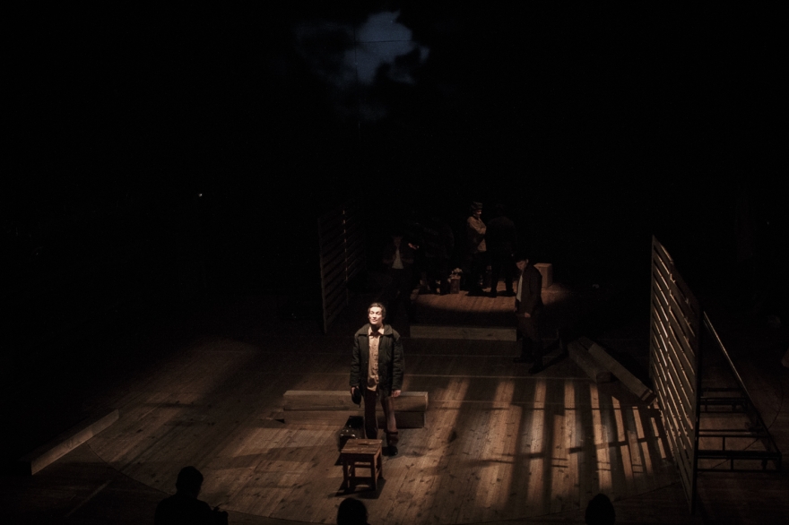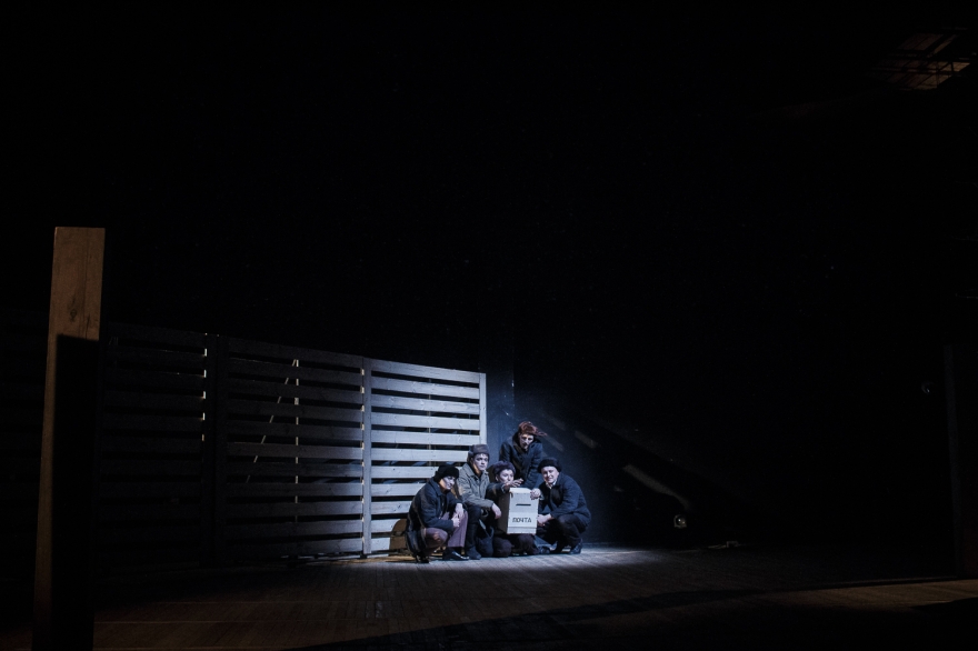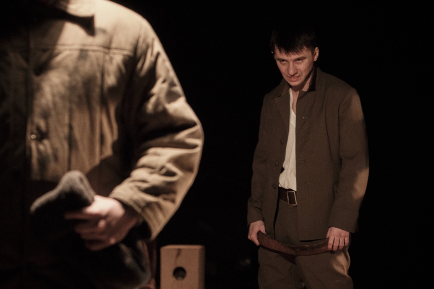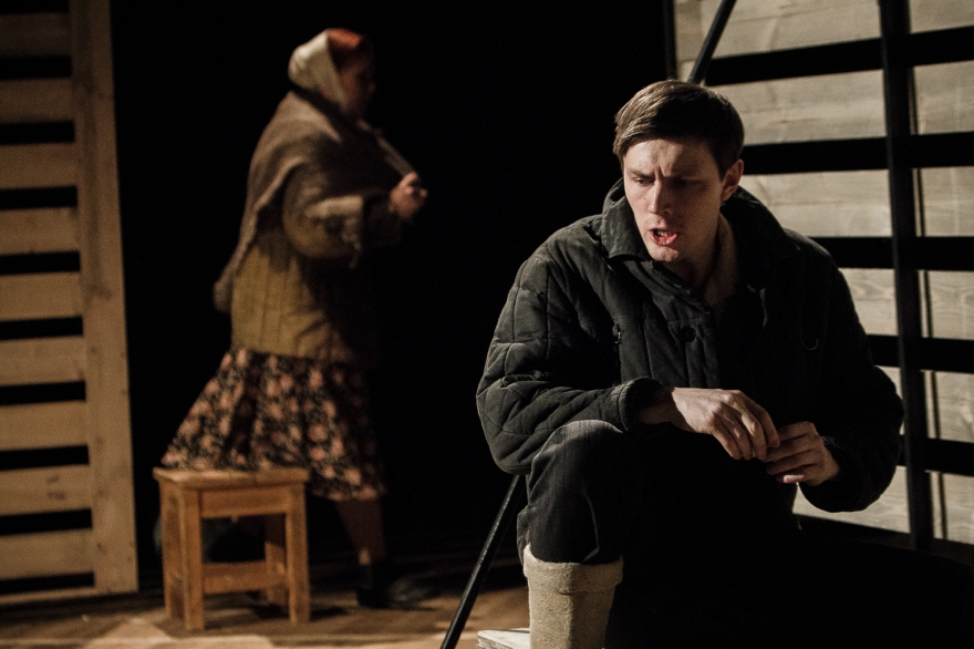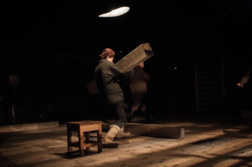 На сцене — заборы из гипермаркетовских досок и несколько столбов. Главная сила – свет: он проникает сквозь ограждения, выхватывает персонажей, что-то среднее между ангелов и вертухаем.