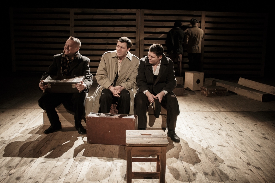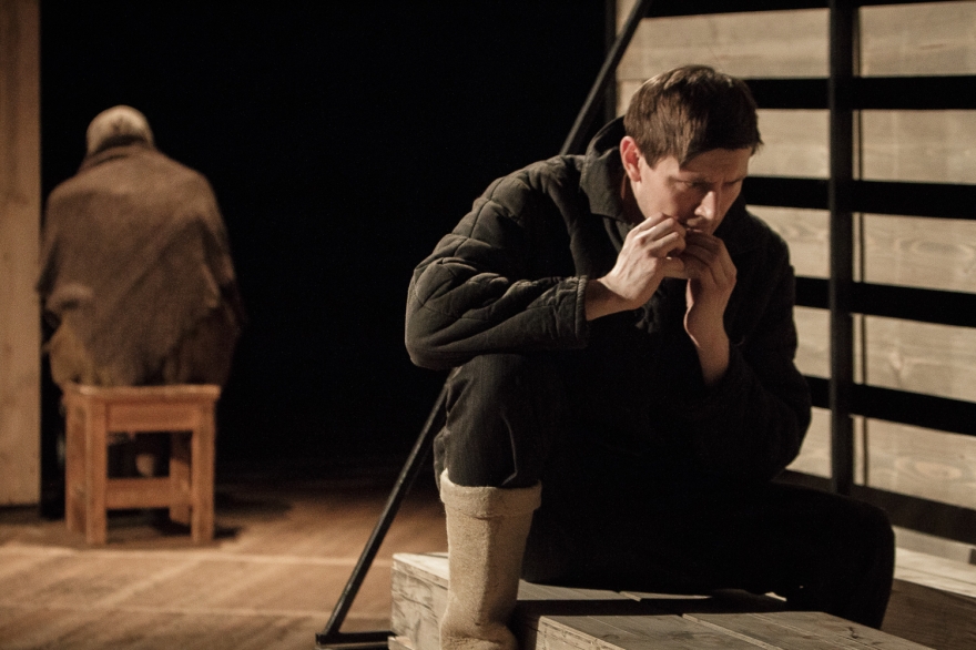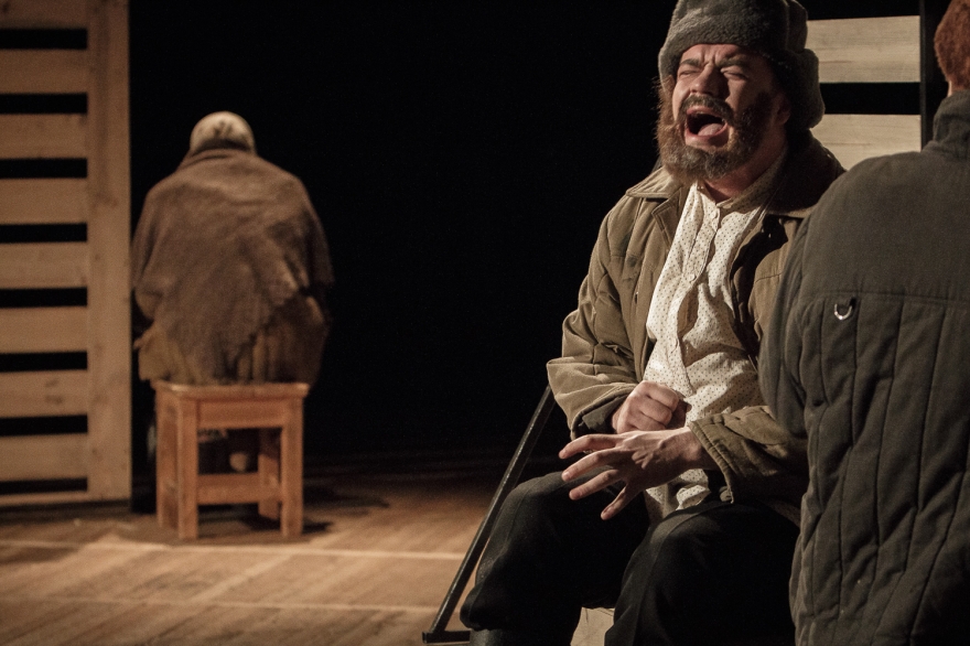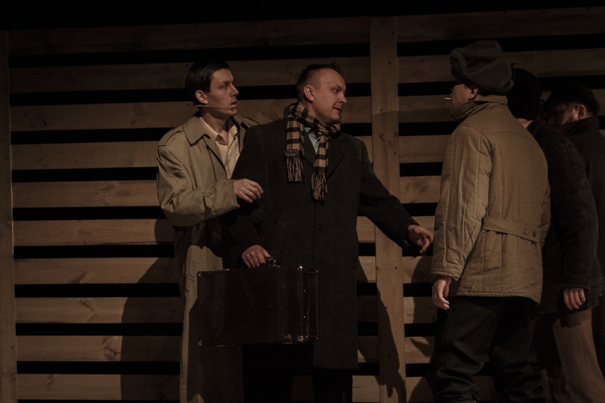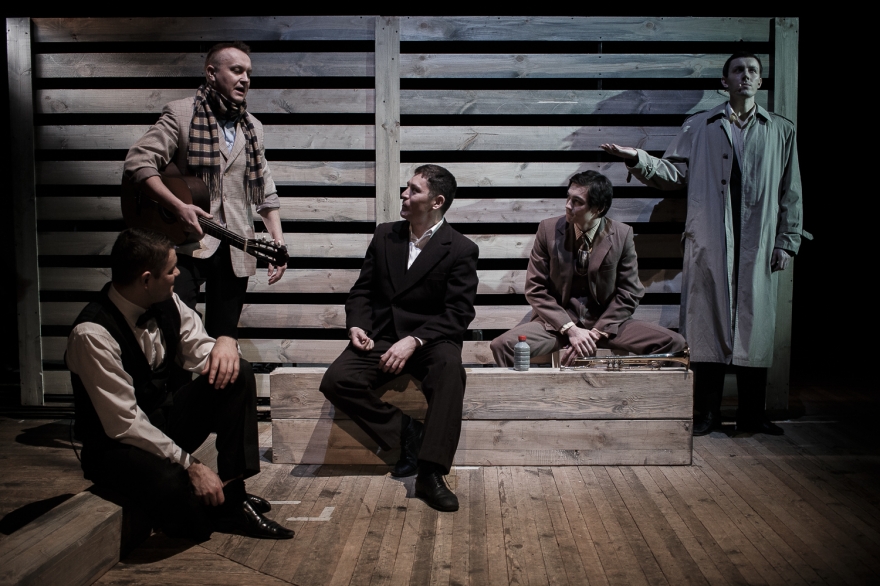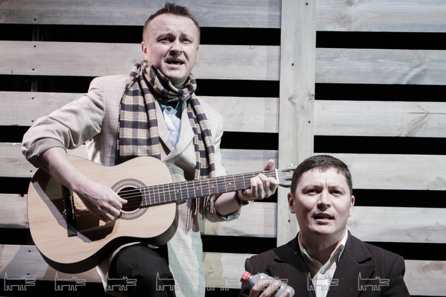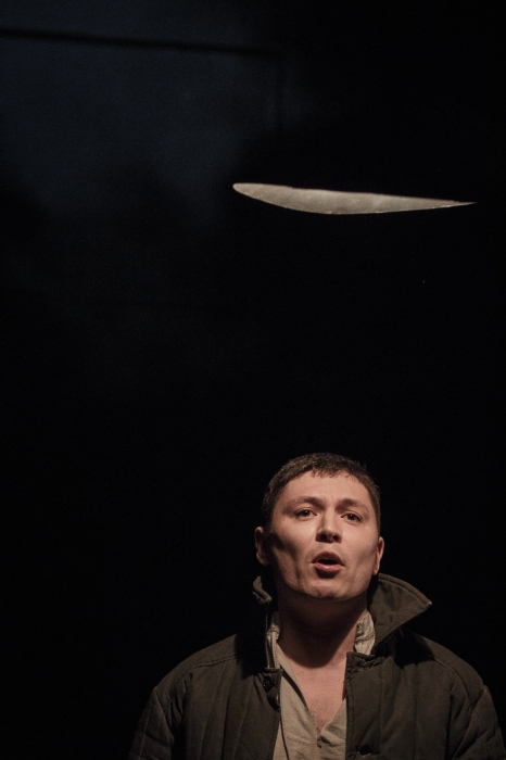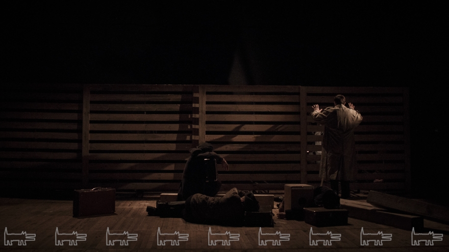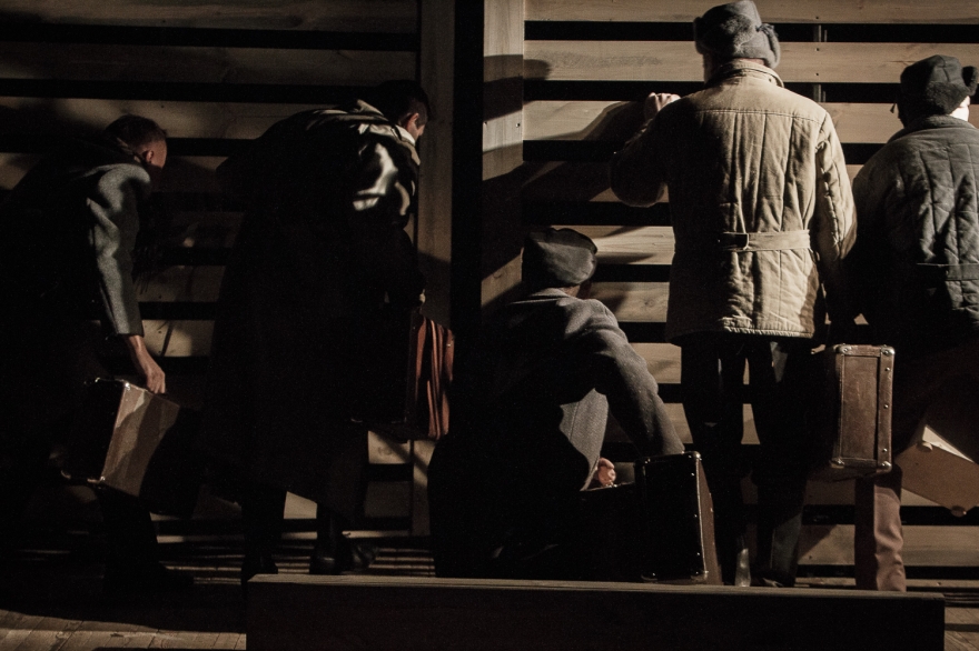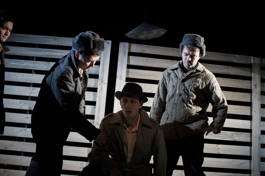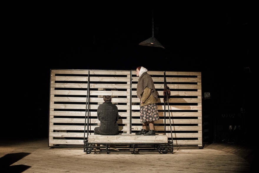 На сцене — заборы из гипермаркетовских досок и несколько столбов. Главная сила – свет: он проникает сквозь ограждения, выхватывает персонажей, что-то среднее между ангелов и вертухаем.