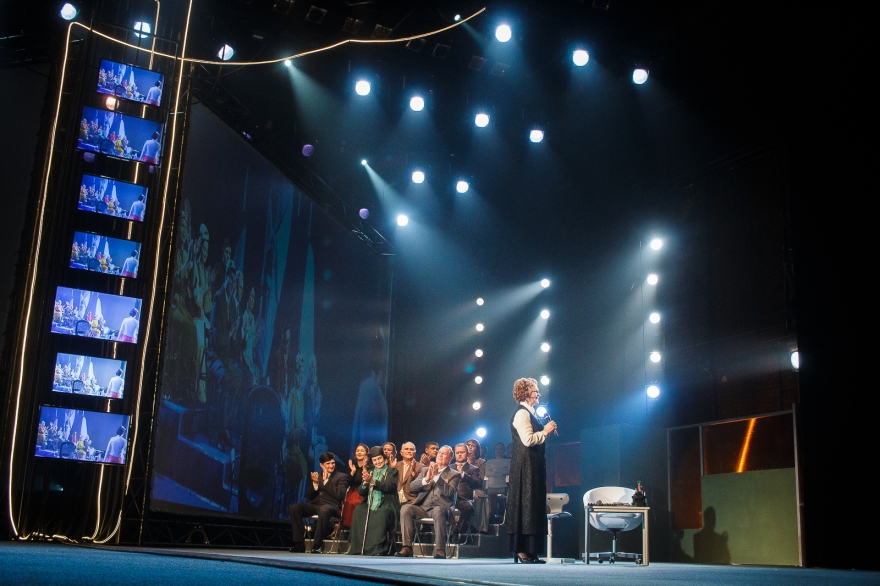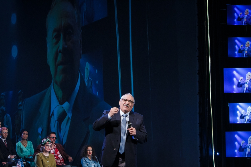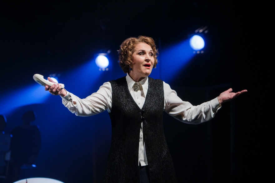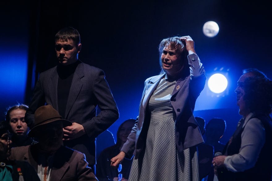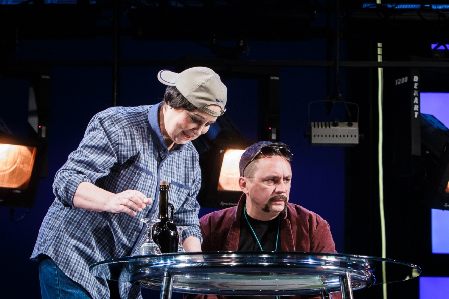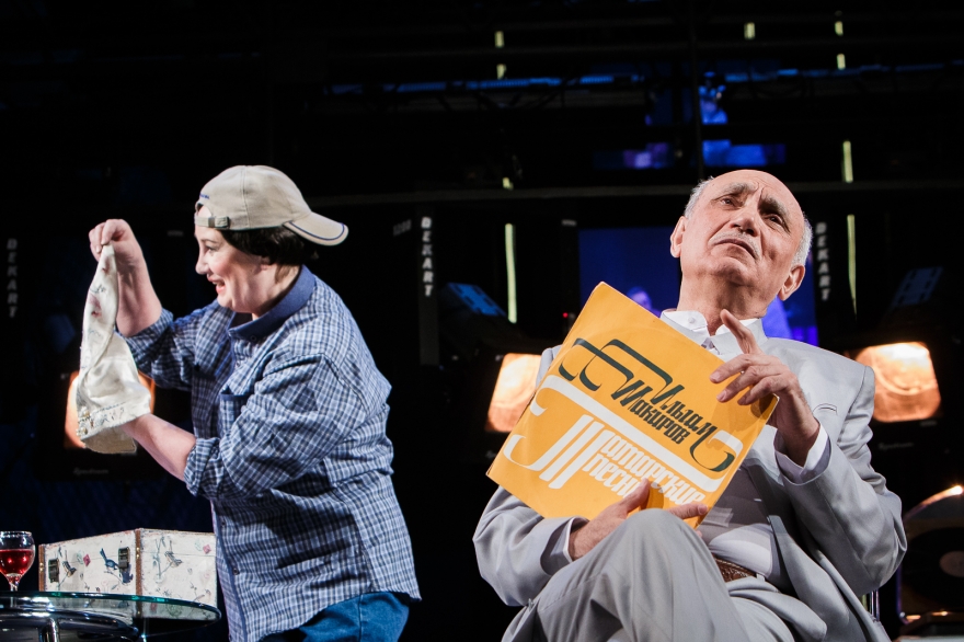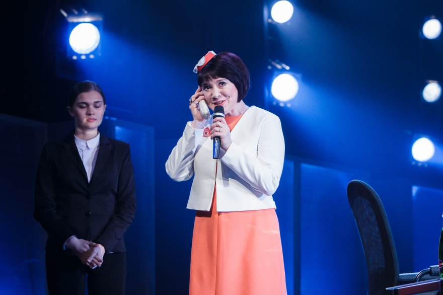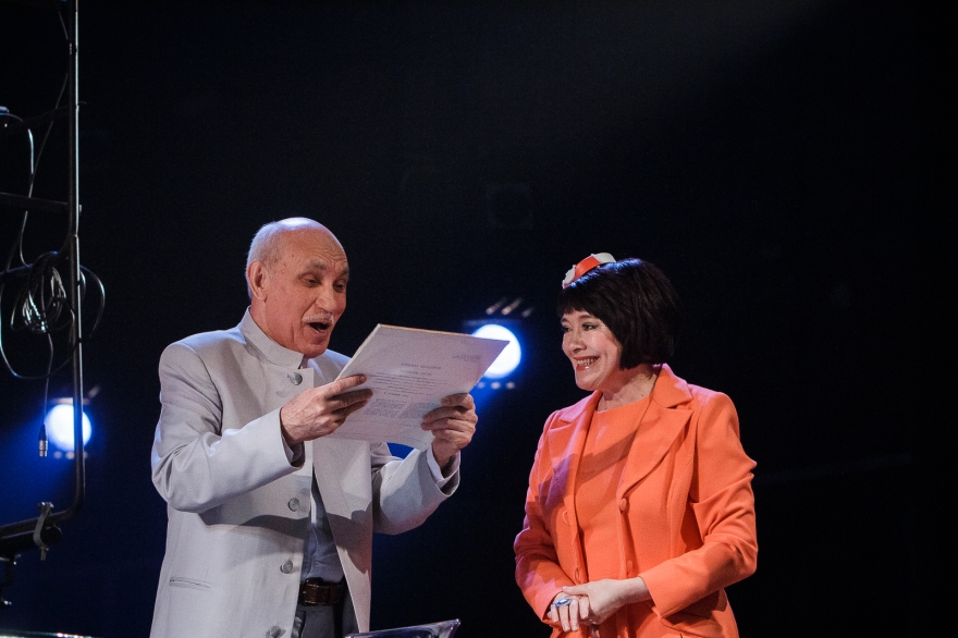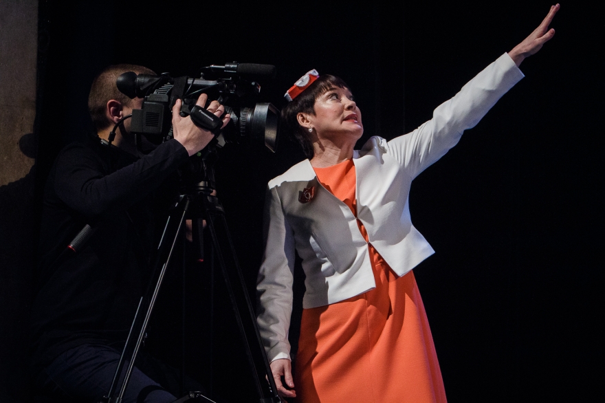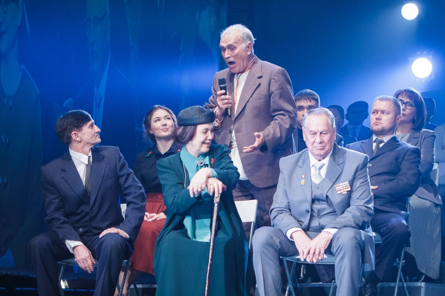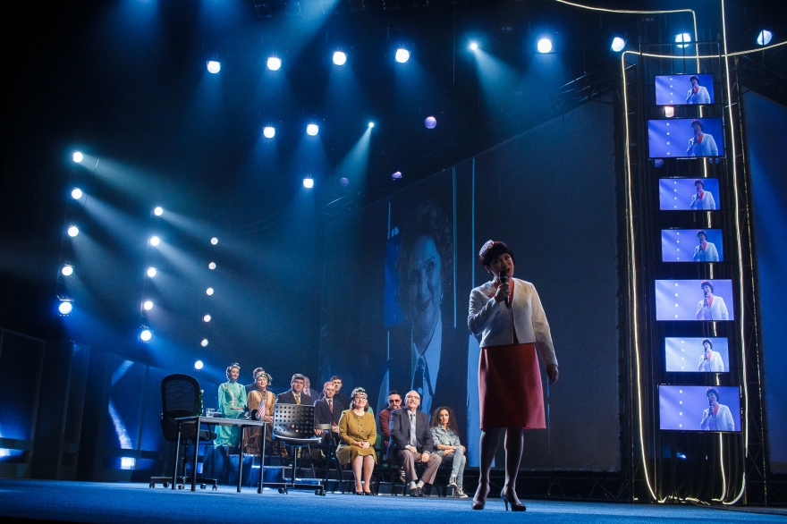Режиссер Фарид Бикчантаев выстраивает на сцене телестудию: камеры транслируют происходящее на большие и не очень экраны, часть зрителей заменяют картонками, рядом с ведущими тусуются гримеры (очень хороша Ляйсан Файзуллина в образе модницы из 80-х), вместо занавеса в антракте опускаются осветительные приборы.