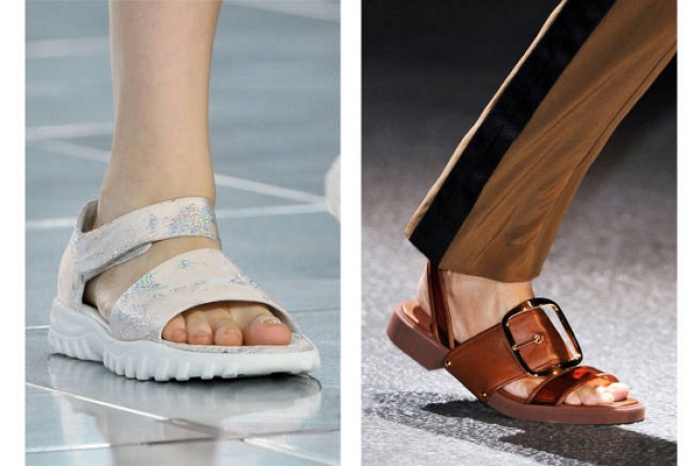 Обувь без каблука в этом сезоне однозначно прощается с нежными балетками. Это не совсем модно. Скорее, привычно, элегантно, женственно, но не модно. Если хочешь быть на гребне волны модной тусовки, выбирай шлепанцы с металлическими вставками, лоферы, сандалии с толстыми ремешками и на платформе.