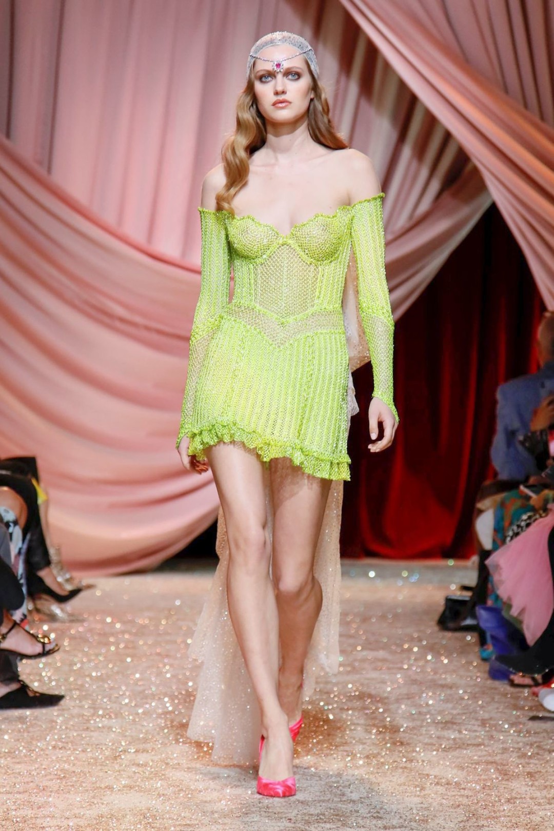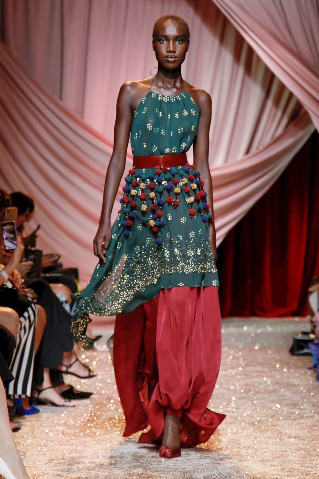 Блестки также повторялись и в самой коллекции: на декольтированных топах-туниках, замешанных с брюками-шароварами, многослойных фатиновых накидках, надетых прямо на обнаженное тело, асимметричных изумрудных купальниках, расшитых мастерами Ulyana Sergeenko вручную, а также корсетированных бюстье, дополненных прозрачными юбками с резинкой.