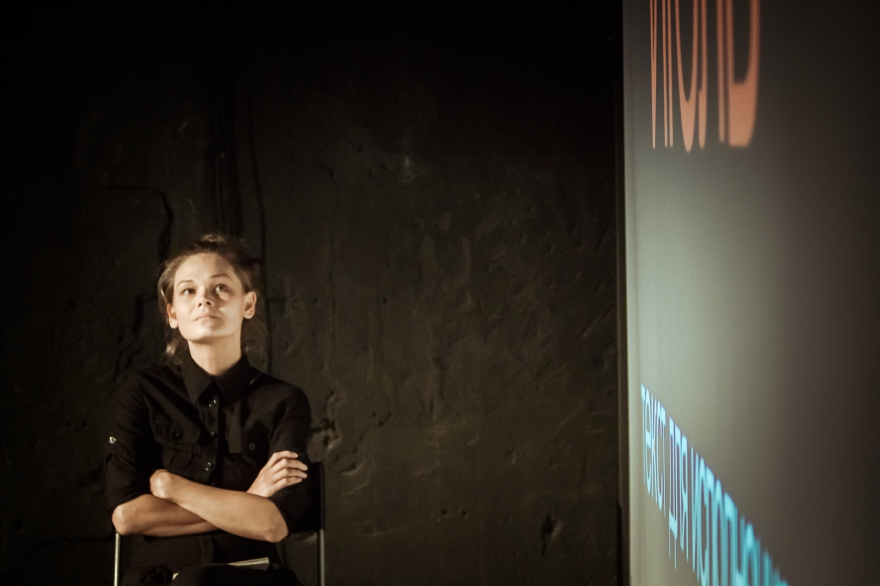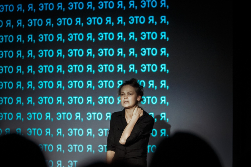 Внутри куба, у стенок которого сидели зрители, находился режиссер театра Дмитрий Волкострелов. Порой оттуда раздавалось щелканье - и тогда менялся фон экрана, гас свет, включались записи «4′33″». Словом, было соучастие. Актеров, как таковых, не было.
