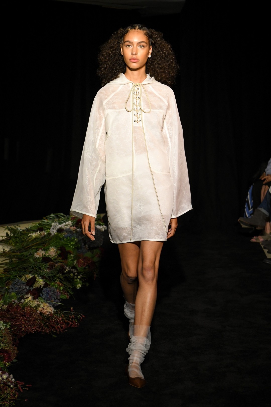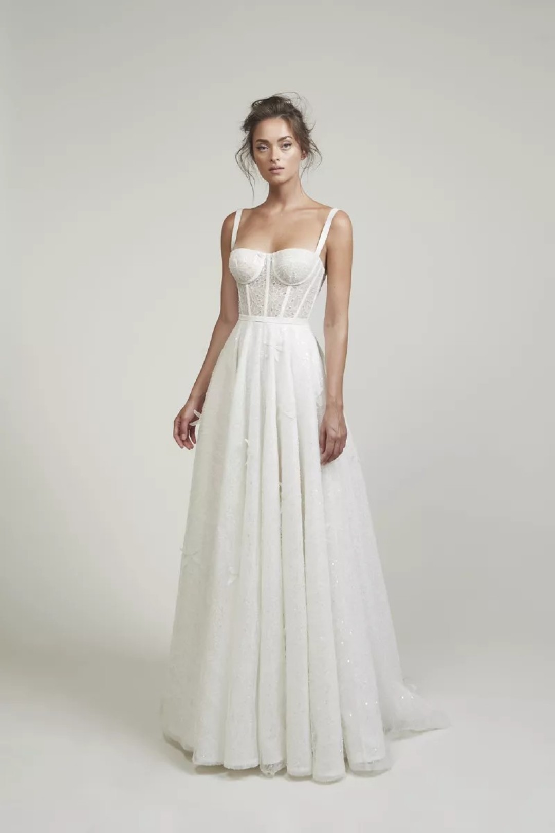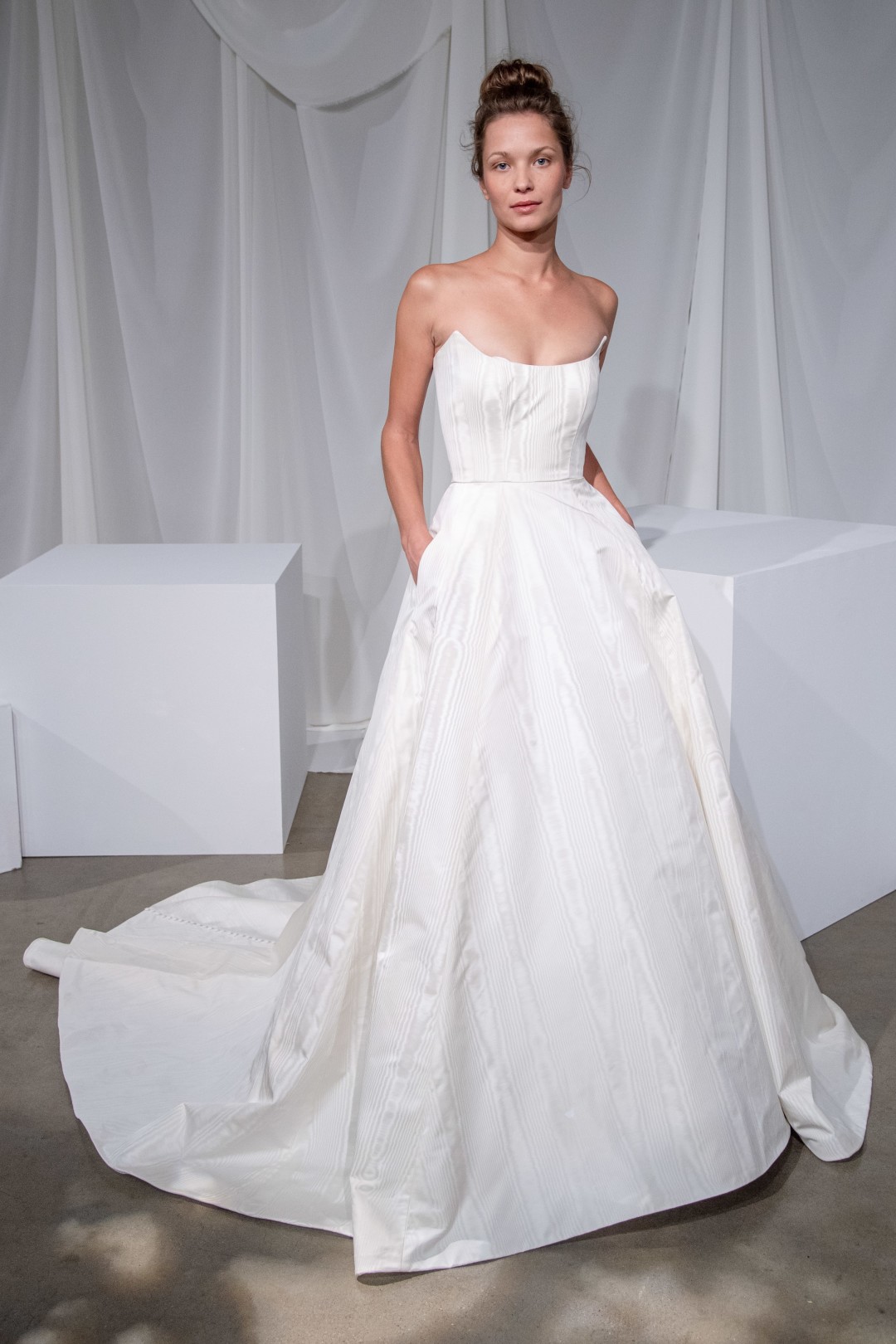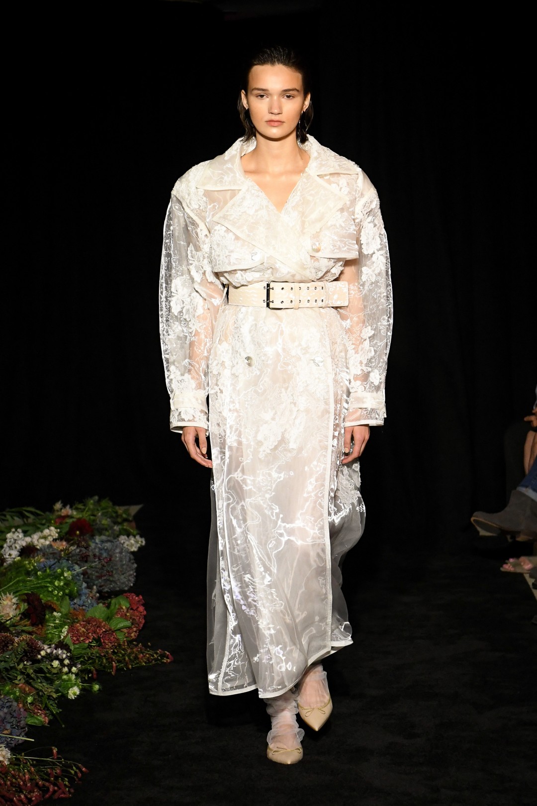 Бренд Danielle Frankel предлагает невестам и вовсе отказаться от платьев — и надеть на свадьбу анорак, плащ или перетянутое поясом пальто. Именно такой вариант идеален для российской непогоды — в случае, если после ЗАГСа у вас запланирована прогулка и не ожидается свадебный банкет. А вот Vera Wang, которые в прошлых сезонах уже экспериментировали и с цветами, и с силуэтами, в этом решили сосредоточиться на работе с декором. Дизайнер марки дополняет платья длинными, напоминающими морскую пучину, шлейфами, а также «гравирует» ткань клятвами в вечной любви. Что-то нам это определенно напоминает: неделю назад в наряде с вышивкой «Пока смерть не разлучит нас» выходила замуж за Джастина Бибера модель Хейли Болдуин. Платье для девушки выполнил Вирджил Абло из Off-White.