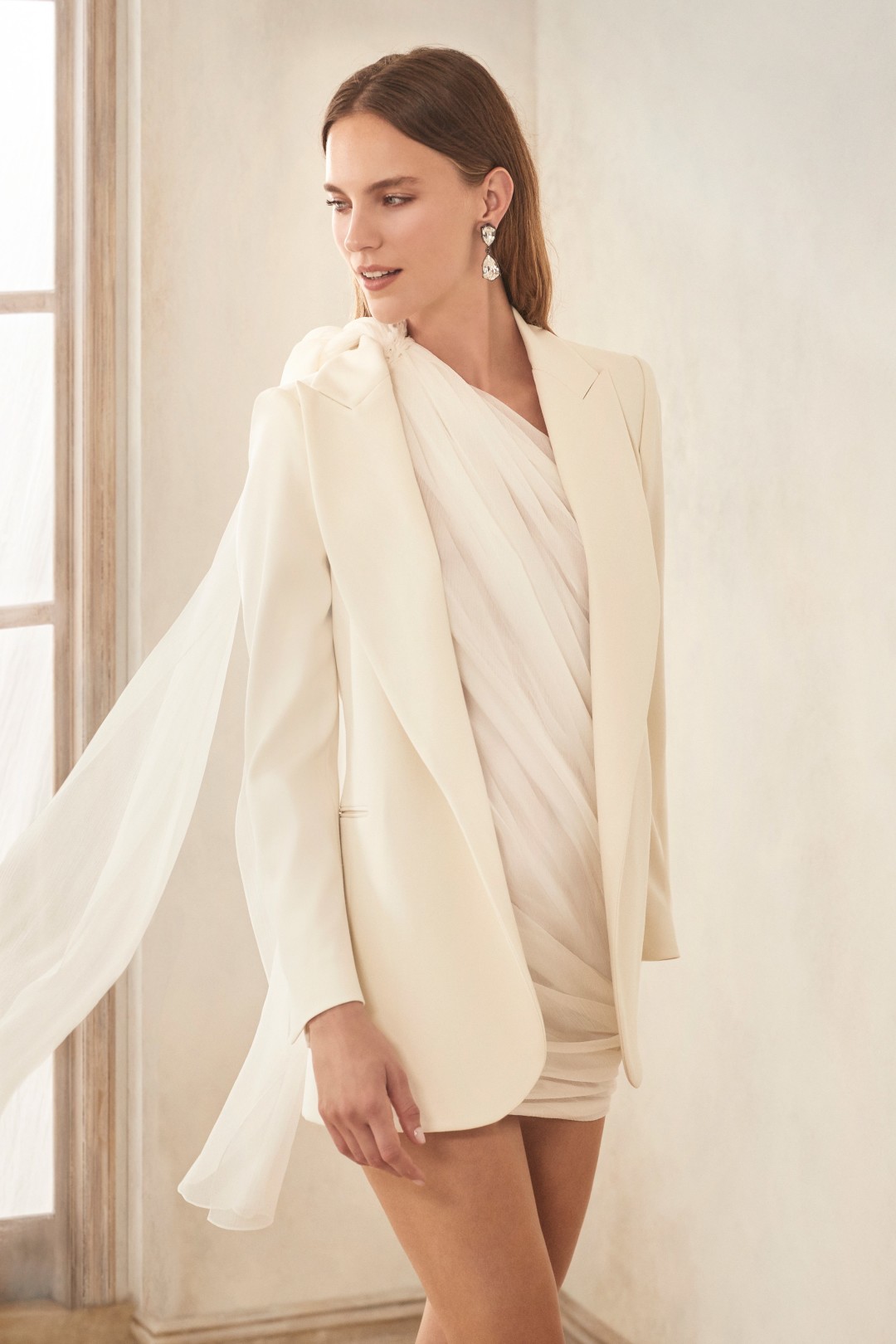 Платья с рюшами, кружевом, декольте и прозрачной тканью, из-под которой виднеются шортики, настолько популярны у сегодняшних невест, что, ожидая своей очереди в городском ЗАГСе, они попросту сливаются в одно белое (разбавленное black-tie костюмами женихов) пятно. Марка Lein предлагает альтернативу в виде черного платья на тонких бретелях, Oscar de la Renta — голубое, похожее на кучевые облака, а Monique Lhuillier — по всей длине украшенное мелкими цветами, как в ready-to-wear коллекциях Givenchy, Altuzarra и Louis Vuitton.